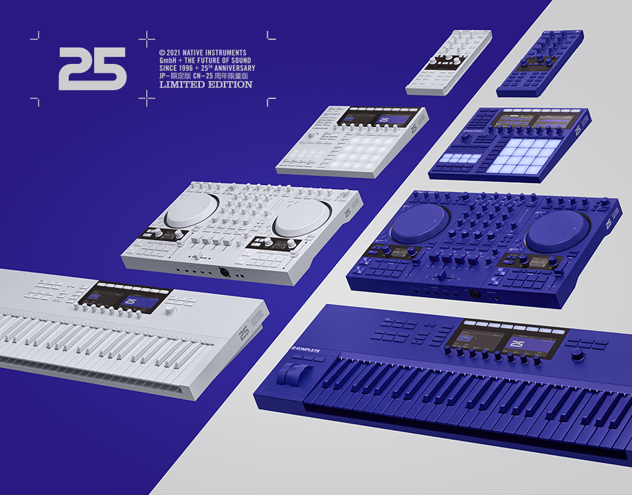 La Colección 25º Aniversario reinventa dispositivos icónicos KOMPLETE, MASCHINE y TRAKTOR en dos esquemas de color: Vapor Gray y Ultraviolet. Los llamativos diseños monocromáticos se dejan ver hasta en el menor detalle de estos instrumentos y controladores, y cada uno de ellos está numerado a mano y rematado con detalles reflectantes que conmemoran el aniversario de NI. Esta es la gama de dispositivos de la colección: MASCHINE+, MASCHINE Mk3, KOMPLETE KONTROL S49/S61, TRAKTOR KONTROL S4 y TRAKTOR KONTROL X1.