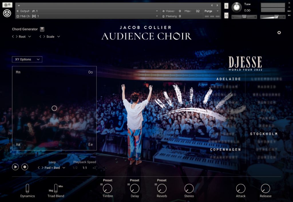 Ahora cualquiera puede experimentar lo que sólo el propio Collier ha experimentado hasta ahora: tocar el coro de su audiencia como un instrumento y agregar un coro de voces reales de todo el mundo a cualquier canción. Este nuevo instrumento Kontakt presenta momentos de 22 shows en vivo diferentes, perfectamente capturados por micrófonos Shure y aparece en todo el nuevo álbum de Jacob Collier, Djesse Vol. 4.