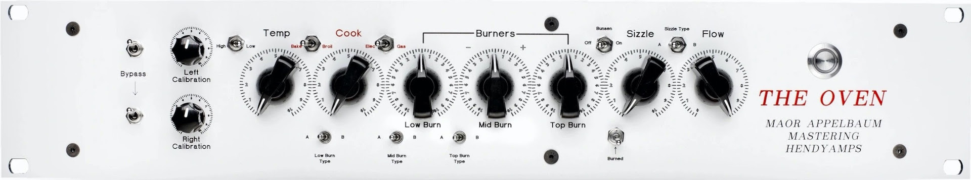 Como se menciona en sus intrigantes controles Temp, Cook, Burners, Sizzle y Flow, THE OVEN está lejos de ser un ecualizador típico, sino más bien una caja de vibración / coloración / mojo con opciones de modelado tonal. Es el impresionante resultado de lo que sucede cuando el ingeniero de masterización internacionalmente aclamado Maor Appelbaum se une al creador de equipos de estudio conectados a mano, HendyAmps.
