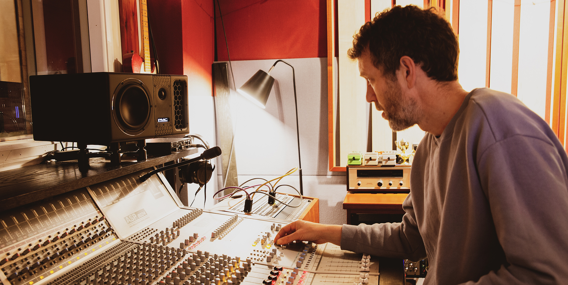 La sala de control de Half-ton Studios también ha sido diseñada como un espacio de escucha acústicamente preciso y está equipada con una consola de mezclas Audient ASP8024 de 24 canales, Pro Tools y una amplia gama de equipos externos analógicos, micrófonos, instrumentos, amplificadores y pedales.