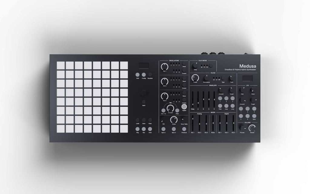 Medusa se desarrolló originalmente en estrecha colaboración con el fabricante griego de sintetizadores y efectos analógicos boutique Dreadbox como una simbiosis de características de síntesis clásicas y un controlador digital único. Incluye seis osciladores; tres opciones analógicas (controladas por voltaje) y tres digitales (con tabla de ondas) y un FILTRO analógico multimodo con L2 (paso bajo de 2 polos), L4 (paso bajo de cuatro polos) y HP (un paso alto de un polo basado en el sintetizador analógico duofónico Erebus de Dreadbox) junto con un secuenciador de 64 pasos (heredando el ADN de la secuencia de Polyend) y una cuadrícula de pads sensibles a la presión de 8 x 8 para reproducir el sintetizador y programar el secuenciador.