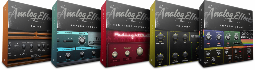 PreSonus ha lanzado cinco efectos de inspiración retro, favoritos de los fanáticos, con la Analog Effects Collection. La colección incluye Analog Delay, Analog Chorus, Red Light Distortion, Rotor y Tricomp®. Cada plugin de efectos de la colección representa la cúspide de la artesanía de PreSonus, desde las etapas drive de State-Space Modeled con texturas sonoras inspiradoras hasta sus interfaces de usuario clásicas de inspiración vintage. Anteriormente solo estaban disponibles en Studio One Professional y Artist, pero ahora estos plugins ahora están disponibles a través del PreSonus Hub en formato VST3, AU y AAX.