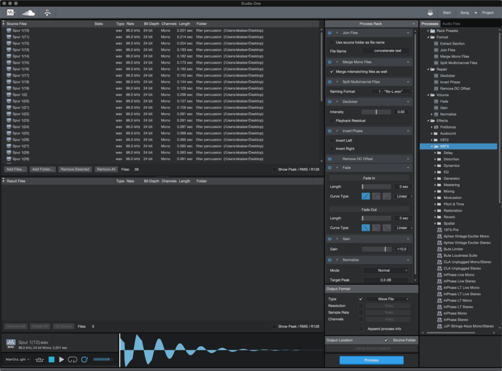 El navegador integrado de Audio Batch Converter permite al usuario crear y editar cadenas de procesamiento a través del mismo flujo de trabajo de arrastrar y soltar al que los usuarios de Studio One ya están acostumbrados. Incluso puede modificar los efectos durante la reproducción en tiempo real, y un reproductor de vista previa integrado le permite previsualizar rápidamente y hacer comparaciones A/B de las señales procesadas y sin procesar.