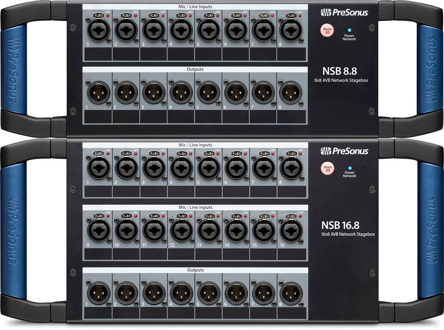 Las cajas de escenario en red AVB NS8 16.8 y 8.8 de PreSonus entregan señales de escenario a la consola a través de un cable ligero Ethernet CAT5e o CAT6. Todas las entradas ofrecen compensación de ganancia para escenarios de entrada compartidos, una característica que normalmente solo se encuentra en sistemas mucho más costosos. Se puede controlar a distancia las entradas de la serie NSB, los preamplificadores, la alimentación phantom y la compensación de ganancia desde una consola serie III en red o desde el software de control táctil de superficie PreSonus UC Surface. El NSB 16.8 de 16×8 ofrece 16 entradas combinadas de micrófono/línea equipadas con preamplificadores XMAX de estado sólido de clase A controlados a distancia de PreSonus. El 8×8 NSB 8.8 ofrece ocho de estas entradas de micrófono/línea. Ambos modelos proporcionan ocho salidas con conectores XLR de bloqueo. Un conmutador AVB de dos puertos incorporado permite conectar en cadena múltiples unidades o utilizar el conmutador PreSonus SW5E AVB para admitir espectáculos e instalaciones más grandes.