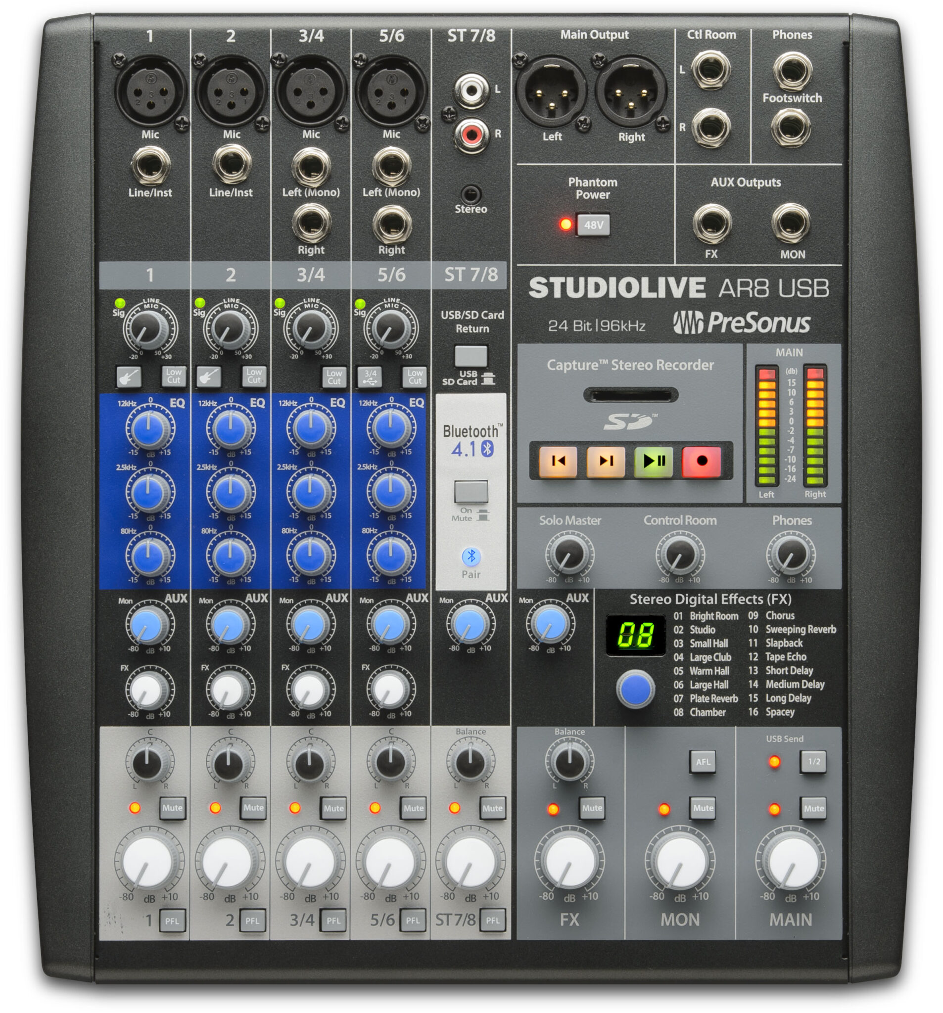 Las mixers StudioLive AR USB cuentan con el exclusivo Super Channel de PreSonus, lo que permite reproducir el audio de cuatro fuentes estéreo simultáneamente. Conecte un reproductor multimedia en las entradas RCA no balanceados del Super Channel. Conecte la tablet a la entrada estéreo de 1/8 pulgadas. Reproduzca audio estéreo desde el grabador SD incorporado o desde su Mac o PC con Windows conectada por USB. Vincule su smartphone a la consola StudioLive AR USB gracias al Bluetooth 4.1 incorporado y obtenga acceso inalámbrico instantáneo a su biblioteca de música para reproducir música funcional, pistas de acompañamiento o entrenamiento auditivo. ¿Tiene una canción que desea que el resto de la banda aprenda? ¡Vincule su smartphone y empiece a ensayar! El Super Channel le permite reproducir el audio de cuatro señales estéreo a la vez.