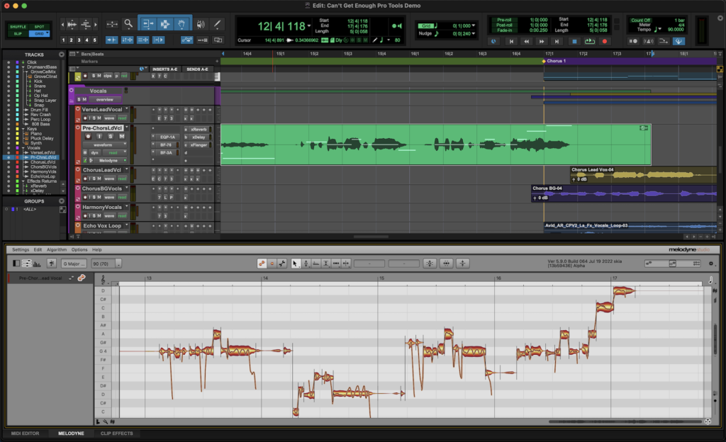 Pro Tools ahora integra perfectamente el software Celemony Melodyne a través de ARA 2 (Acceso aleatorio de audio) para afinar voces rápidamente y crear armonías, cambiar la voz de los instrumentos, corregir la sincronización del ritmo y mucho más. Melodyne es utilizado por innumerables ingenieros en todo el mundo todos los días y la profunda integración de ARA 2 les permitirá trabajar significativamente más rápido y más fácil sin tener que usar audio de ida y vuelta. La interfaz de usuario de Melodyne ahora está convenientemente anclada en la ventana de edición de Pro Tools y se puede aplicar a pistas completas a la vez o simplemente usarse clip por clip. Lea el blog de integración ARA 2 Melodyne de Avid para obtener más información.