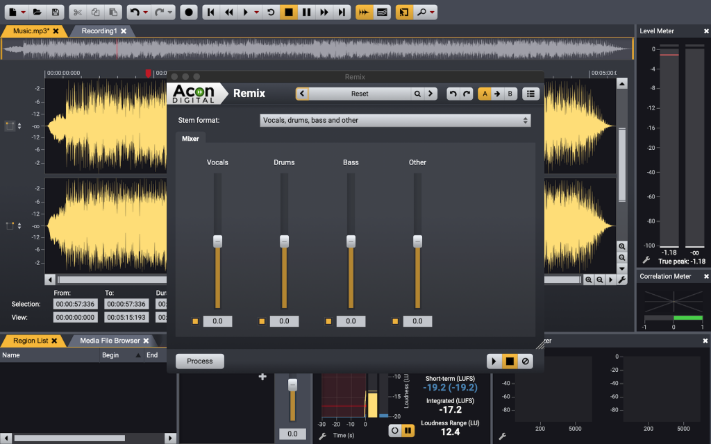 El Remix Tool, otra de las novedades de la última actualización que también utiliza inteligencia artificial, nos permite dividir una mezcla completa en hasta cinco steams y realizar una re-mezcla en tiempo real. También podemos importar pistas de una sesión multipista y dividirlas.