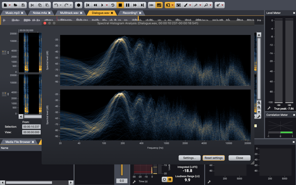 Por último, contamos con herramientas de análisis detalladas, como el espectograma, Wavelet, histograma espectral y estadísticas detalladas.