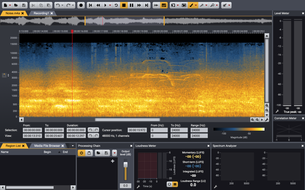 La edición espectral, también disponible con Premium, es una herramienta de retoque que elimina el ruido basado en una selección, ya sea de tiempo, rango de frecuencias o ambas. Además, gracias a la tecnología de mejora de resolución temporal, es más sencillo detectar problemas. Los espectrogramas generalmente se vuelven borrosos al hacer zoom en una región, pero con el nuevo esquema de color tenemos acceso a más detalles.