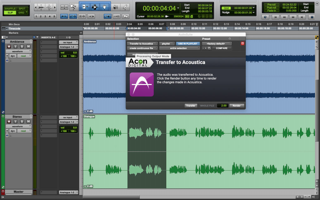 Acoustica también incluye una utilidad para transferir una selección de audio directamente desde Pro Tools sin necesidad de salir de este. Esta opción podemos encontrarla en el menú AudioSuite.