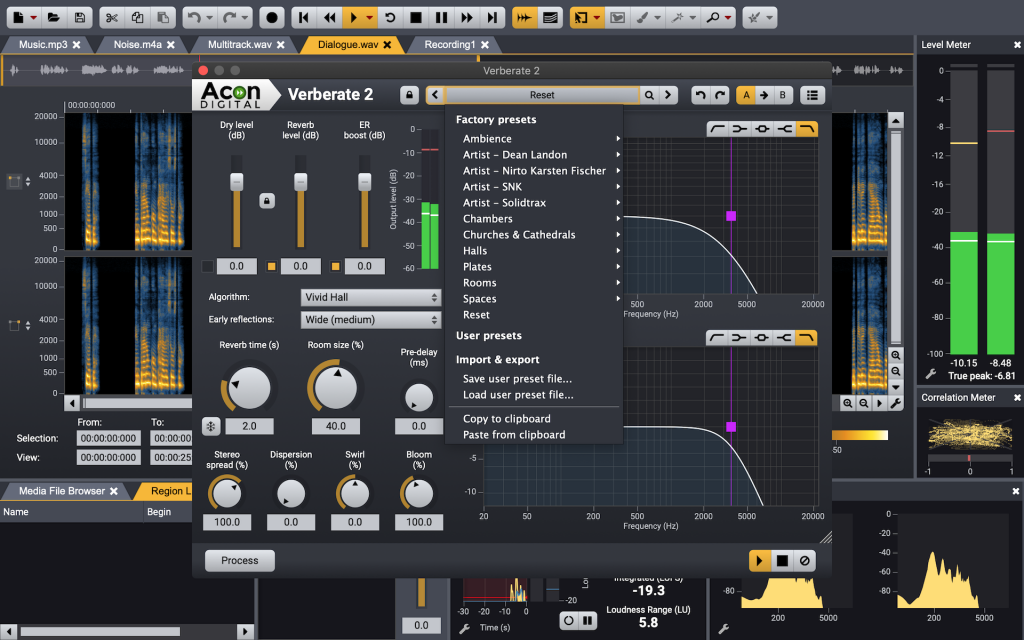 Verberate 2 nos ofrece una reverberación algorítmica con gran versatilidad y alta calidad, capaz de simular numerosos espacios con una asombrosa credibilidad. Además, Acoustica nos ofrece una gran selección de efectos como Echo, Chorus, Phaser, Flanger, Time Stretch, Transpose, Harmonize y Reverse.