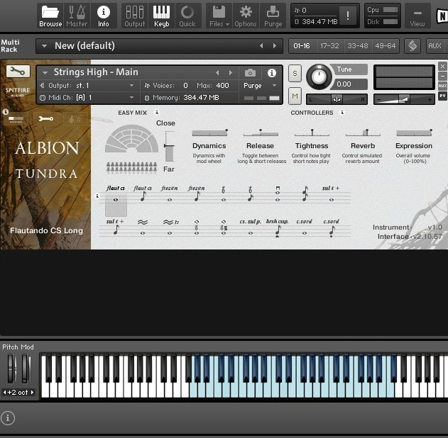 En la parte posterior tenemos todas las opciones de ejecución musical. Son alrededor de 20, que van desde simplemente sentir aire en el caso de los vientos, hasta staccato, sustain, vibrato, trinos, etc. Si bien se pueden ir cambiando a medida que tocamos en tiempo real, la octava para hacer los cambios en el controlador, la pusieron 5 octavas debajo de donde empieza la primera nota, lo que no resulta cómodo si uno posee un controlador mediano de 4 octavas. Si bien con el Kontakt podemos asignarlo a nuestro antojo, hubiera sido más conveniente que por default estuviera mas cerca y accesible para un controlador standart. Los ensambles están didividos en High y Low, lo cual también hubiera preferido que estén juntos, pero entiendo que lo que pesa cada uno haría imposible combinarlos en un preset.