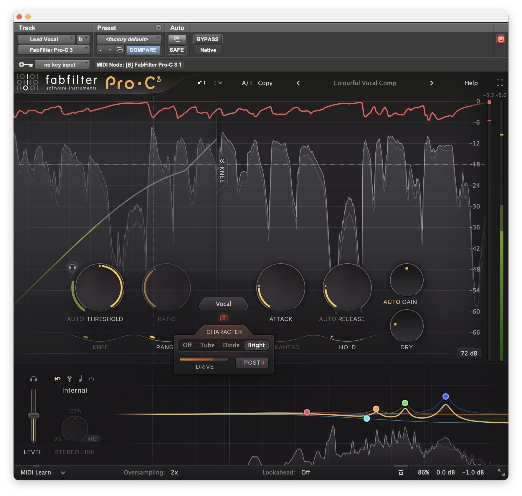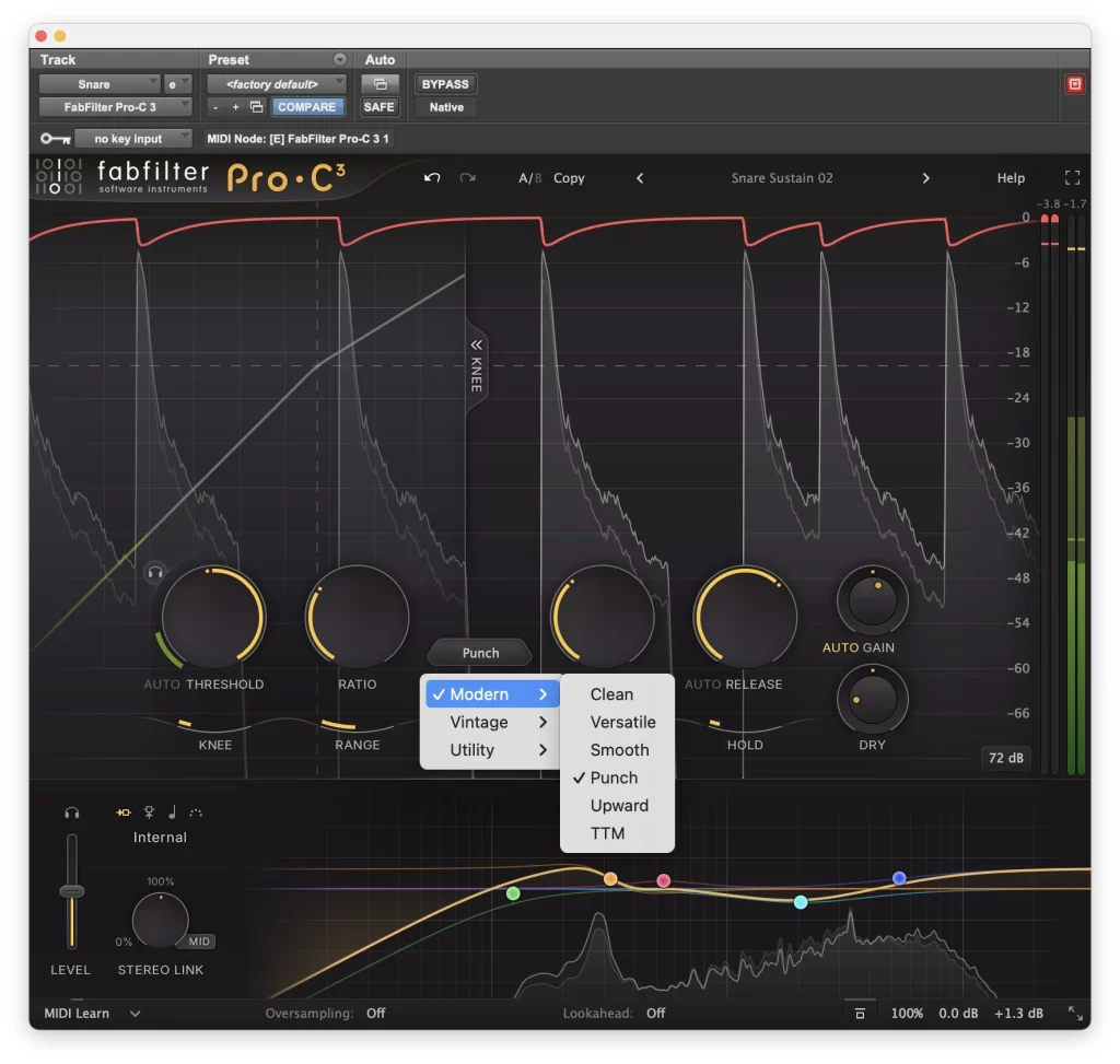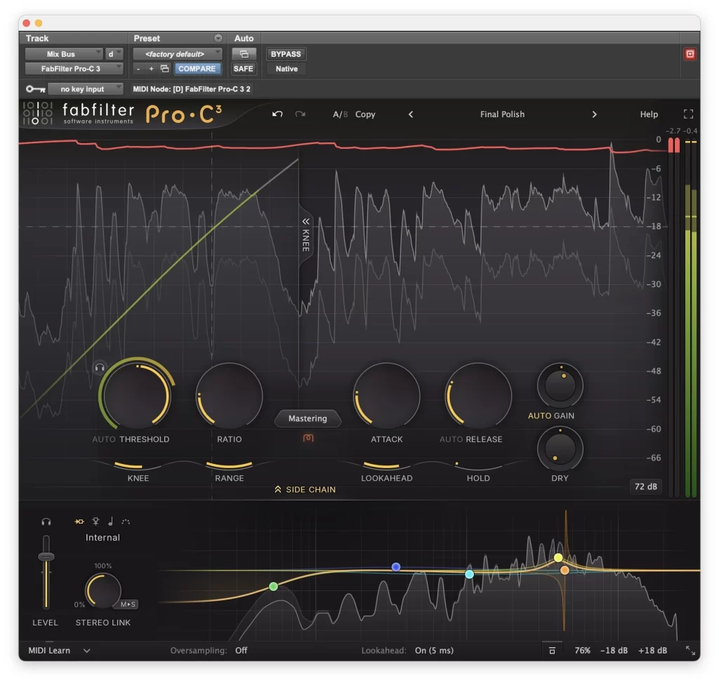 El sidechain siempre fue un punto fuerte de Pro-C y en esta versión se refina aún más. El ecualizador de detección, basado en la tecnología de la serie Pro-Q, permite definir con mucha precisión qué parte del espectro activa la compresión.