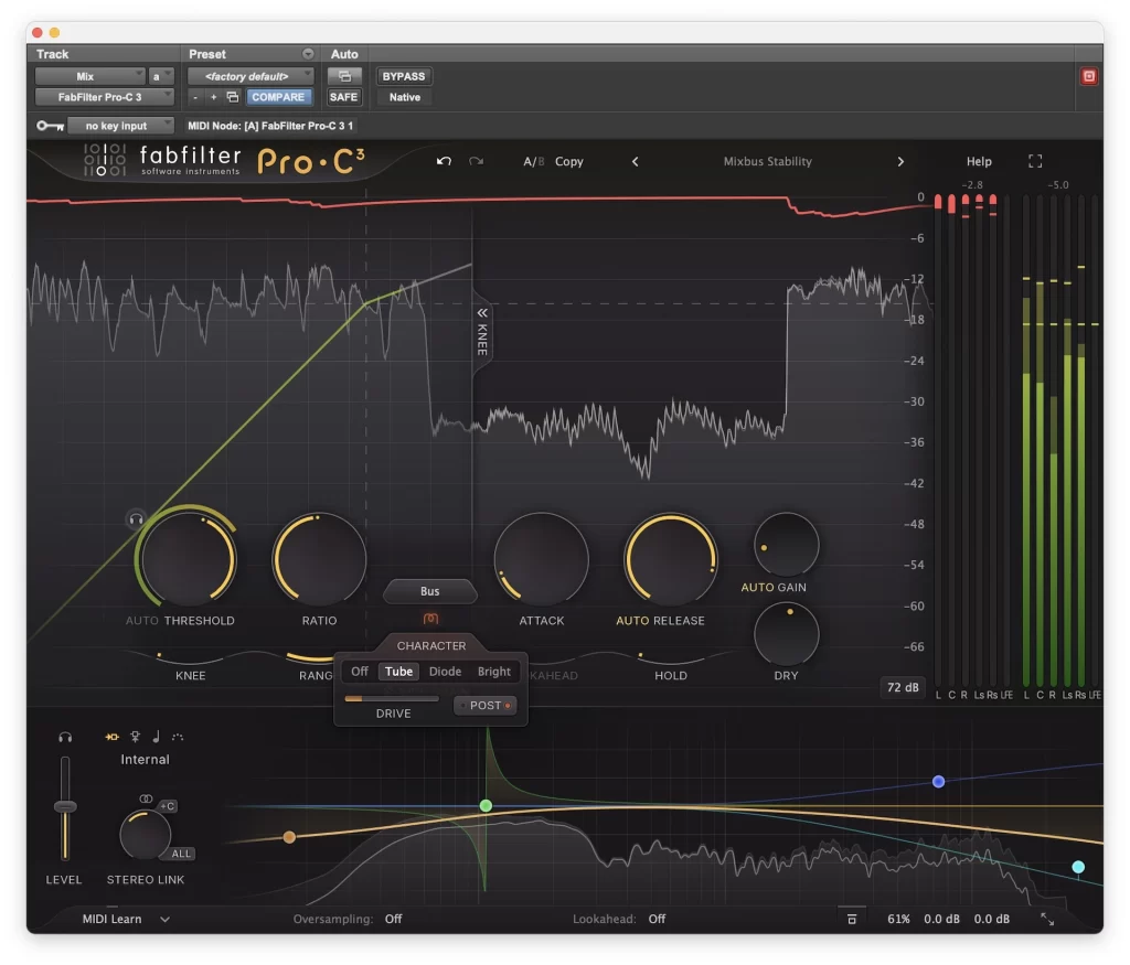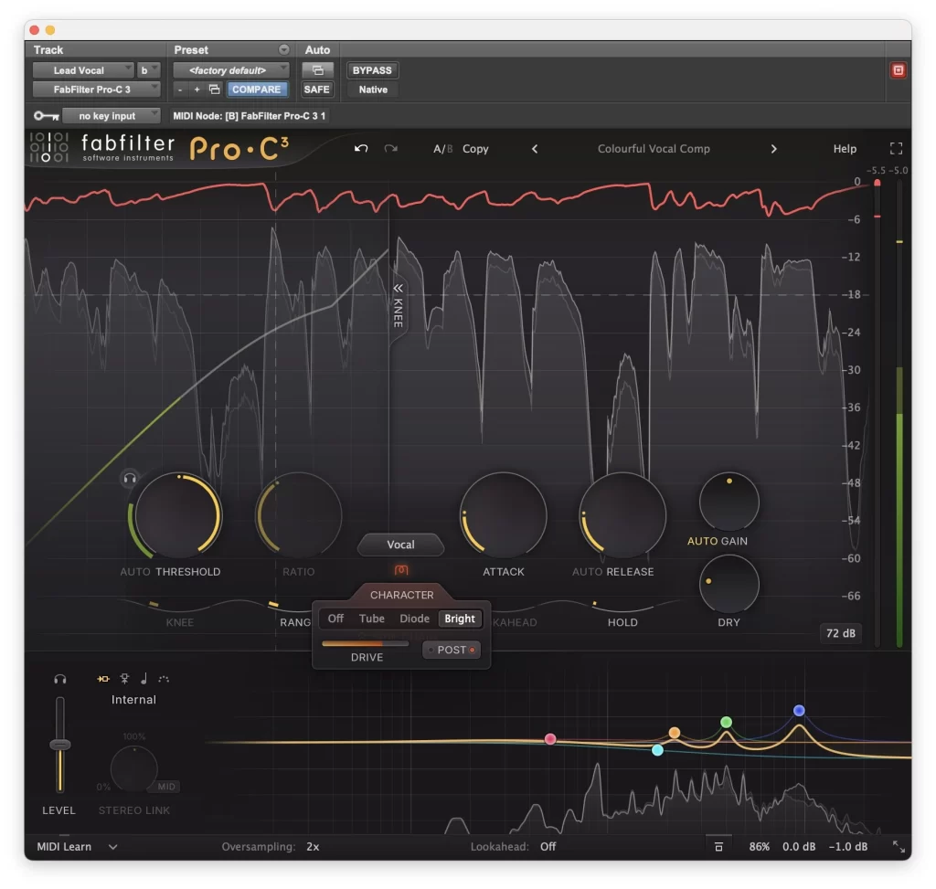 Una de las novedades más relevantes de Pro-C 3 es la incorporación de la sección Character. Aquí, FabFilter introduce opciones de saturación armónica integradas directamente al proceso de compresión, con distintos perfiles y control de intensidad.