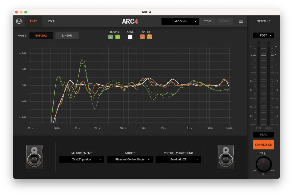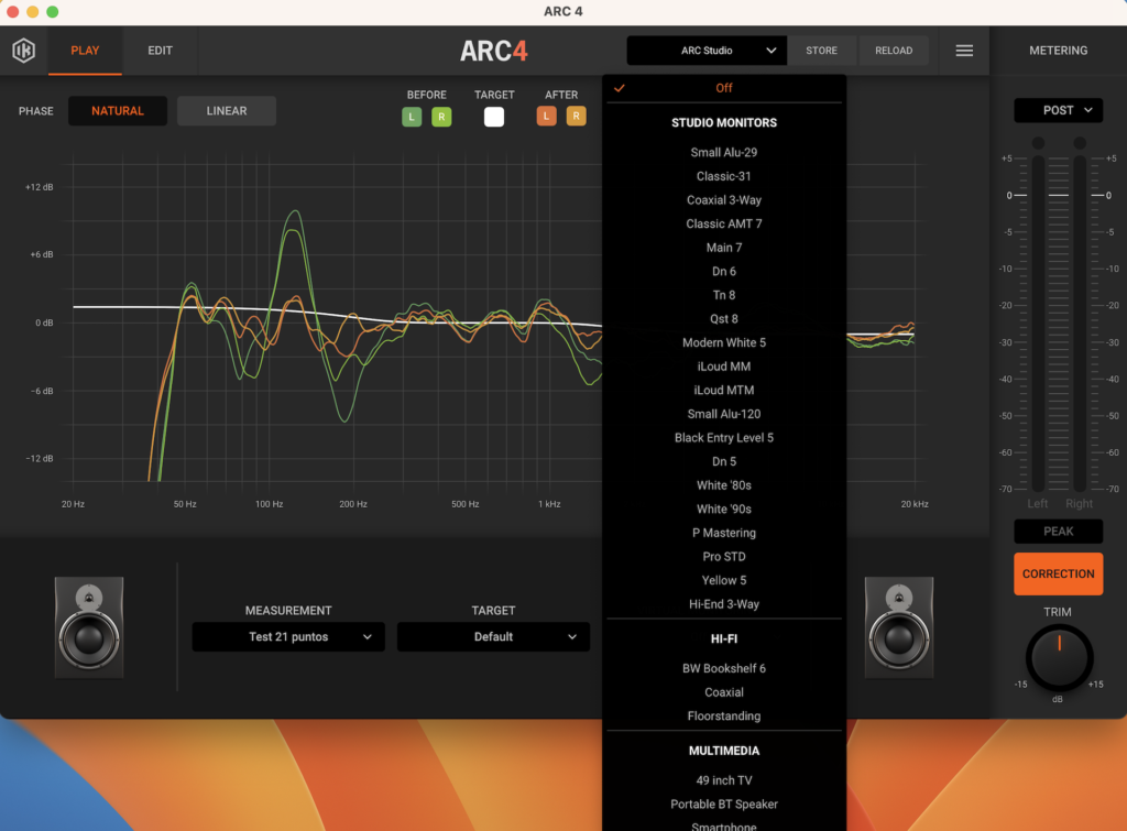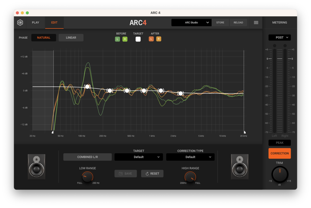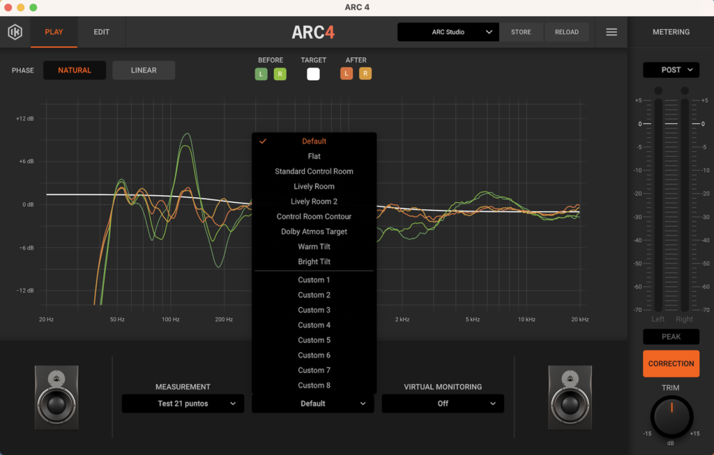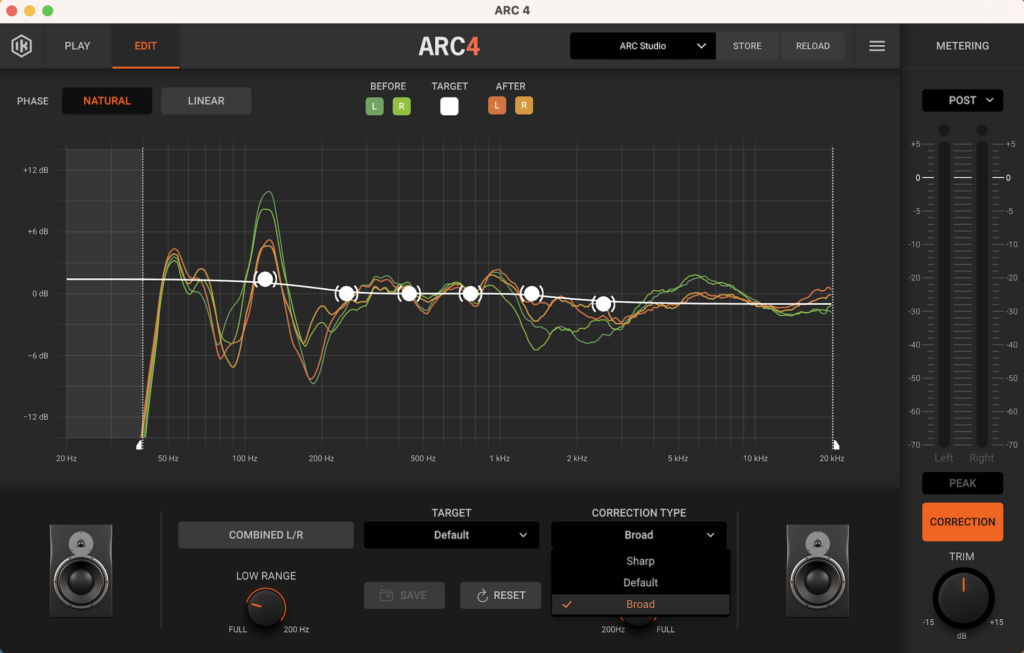 ARC Studio también ofrece muchos más parámetros para ajustar. Nos encontramos con un botón TARGET que despliega una serie de curvas de objetivo y el botón VIRTUAL MONITORING, que nos permite comprobar cómo se traduce nuestra escucha en diversos altavoces y dispositivos. También nos encontramos con un medidor que podremos configurar en PEAK, RMS o LUFS, así como verificar el nivel de señal antes y después del proceso (PRE y POST). Finalmente, el botón EDIT habilita una serie de opciones como corregir la curva TARGET con puntos personalizables; corrección LOW-RANGE y HIGH RANGE, que nos permite limitar el rango de corrección (por defecto de 20 to 20 kHz) y CORRECTION TYPE, que nos ofrece la posibilidad de ajustar los filtros de corrección.