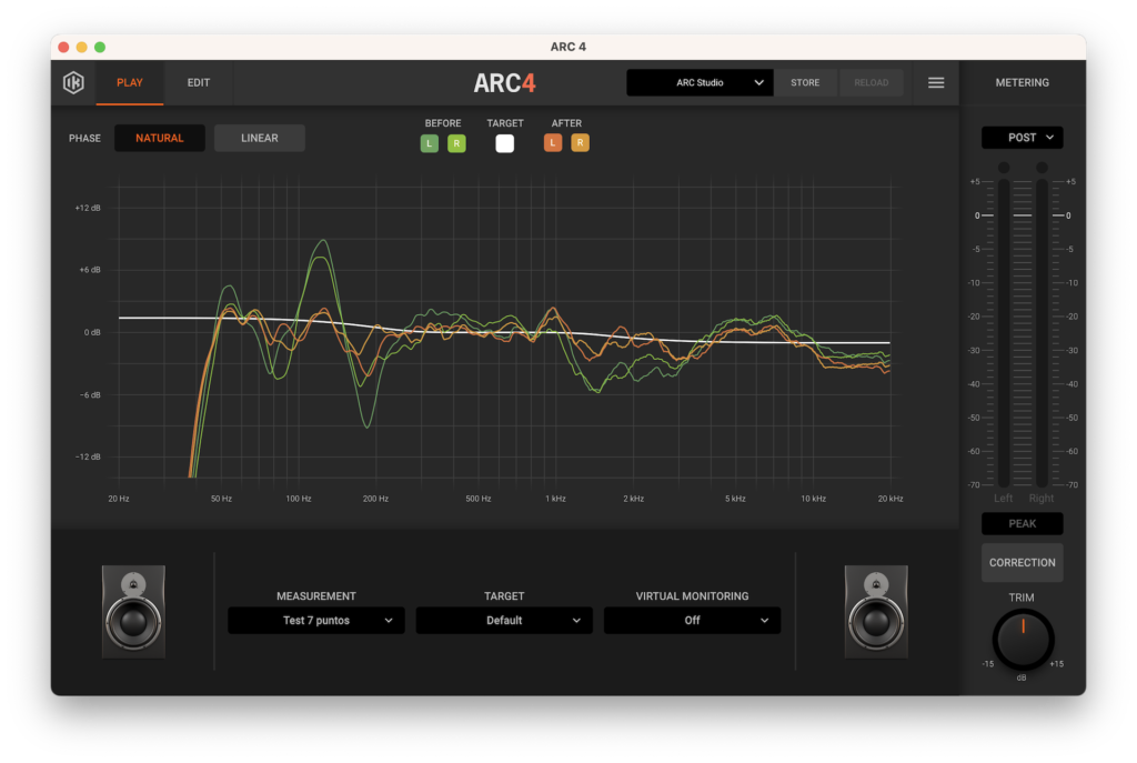 Lo último será conectar la unidad de procesamiento entre nuestra interfaz de audio y nuestros monitores. Abrir la aplicación ARC Studio y seleccionar nuestro análisis desde la pestaña MEASUREMENT. Visualizaremos un gráfico de respuesta de frecuencias donde las líneas verdes (Izq-Der) representan la respuesta de frecuencia original que medimos, las líneas naranjas (Izq-Der) representan la respuesta de frecuencias corregidas y la línea blanca representa la curva objetivo seleccionada.