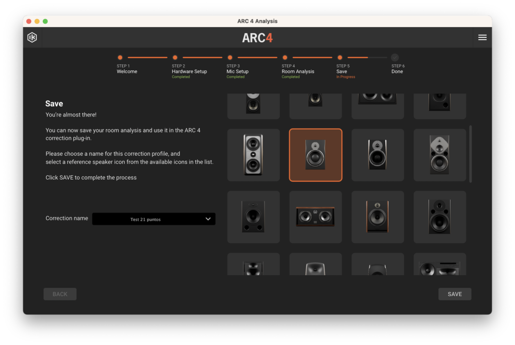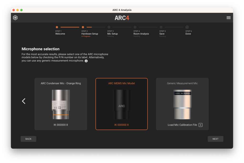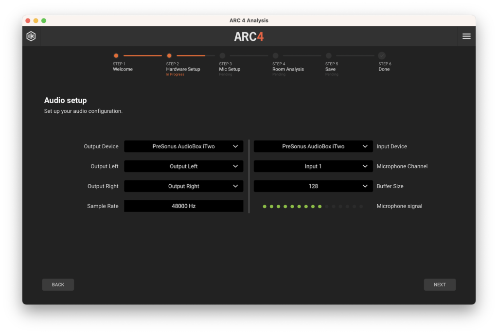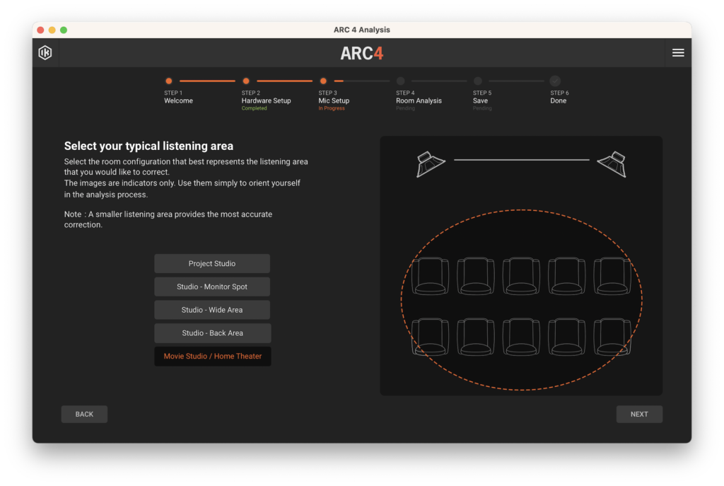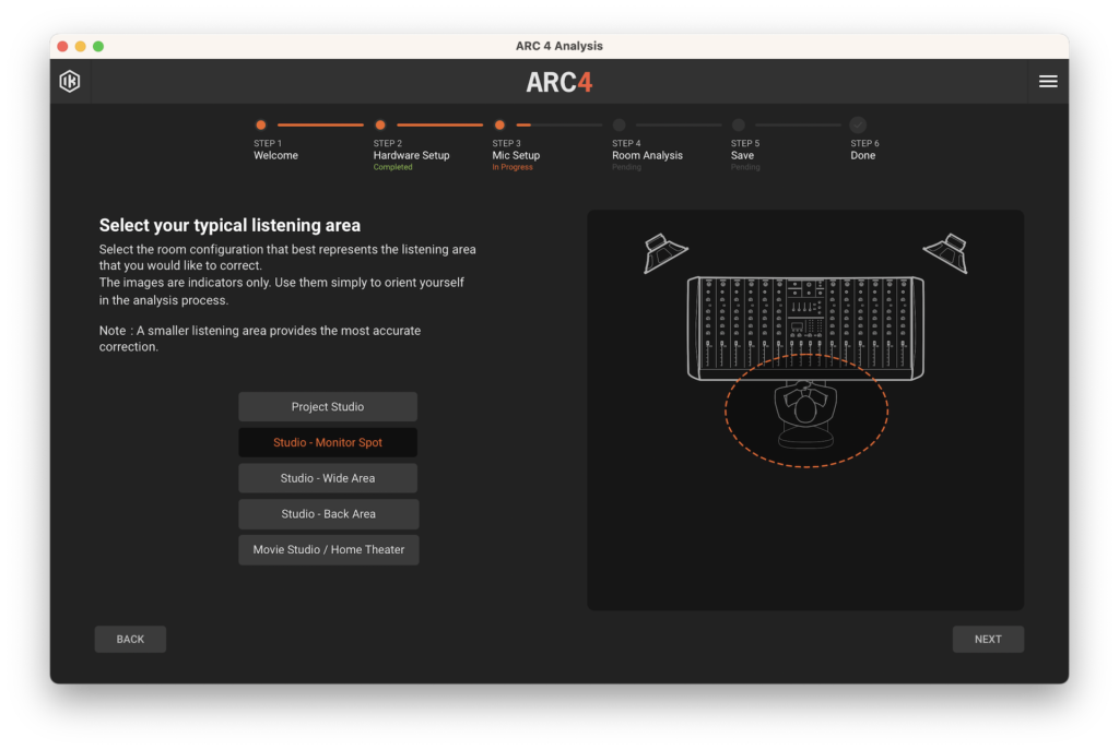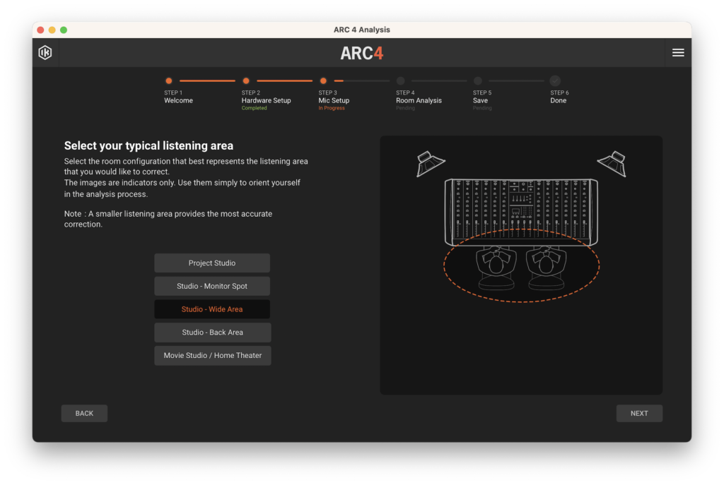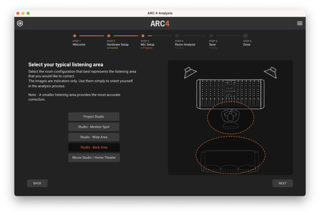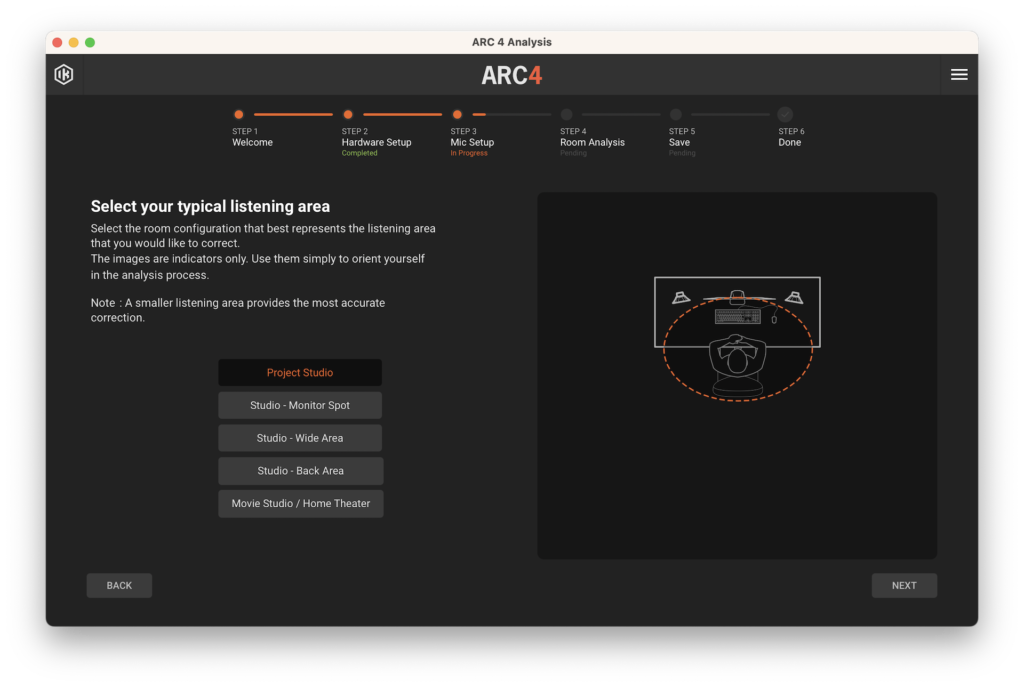 Luego, comenzamos con el proceso de calibración, conectando el micrófono de medición a nuestra interfaz de audio, abriendo ARC Studio Analysis y, a partir de allí, el software nos guiará paso a paso. El primero será una sencilla pantalla de bienvenida y en el segundo habrá que seleccionar el tipo de micrófono y la configuración de audio, como dispositivo de salida y entrada, Sample Rate, tamaño de Buffer, entre otros. El tercer paso es donde seleccionaremos el área de escucha que más se asemeje a nuestro espacio de trabajo.