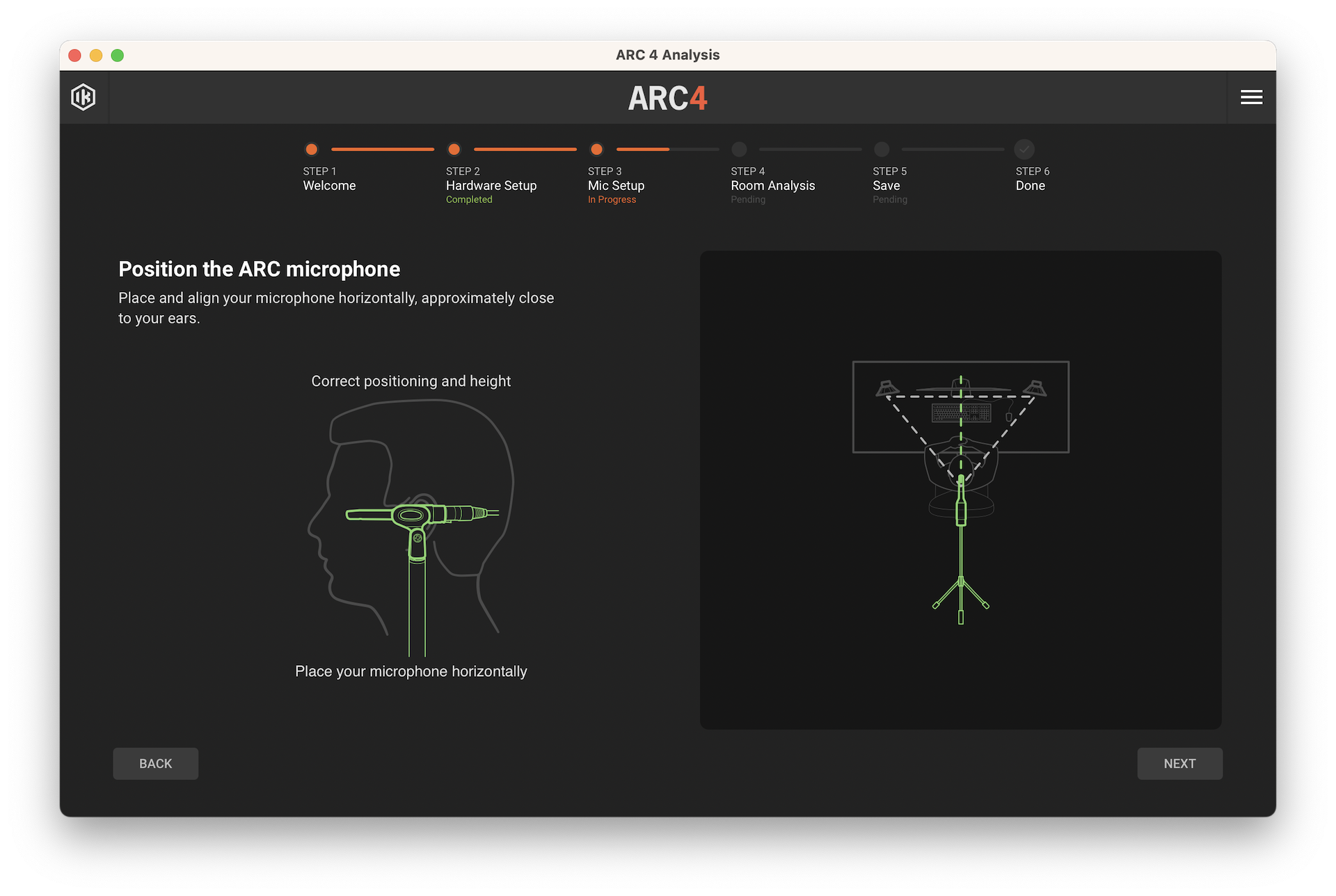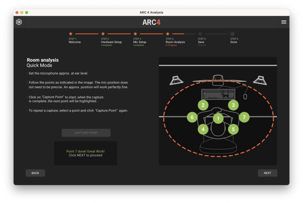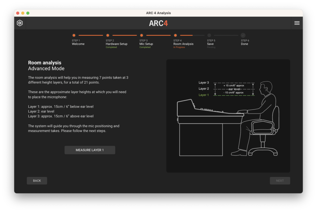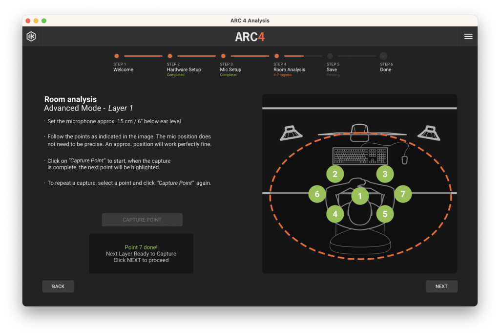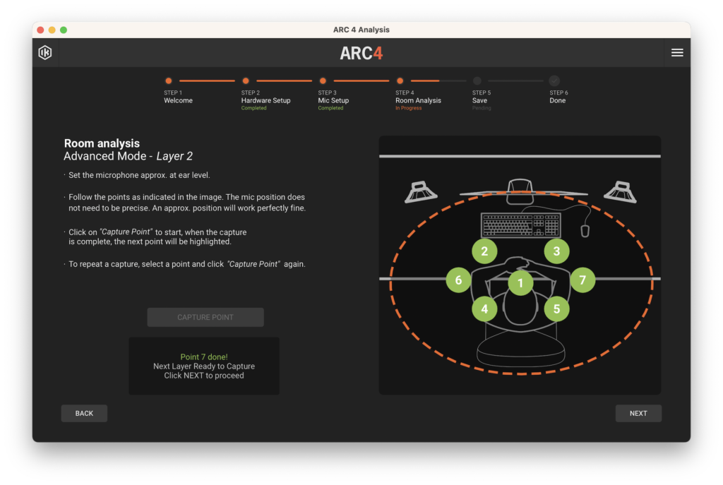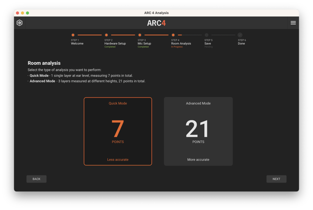 En el cuarto paso tendremos dos opciones, un análisis rápido de 7 posiciones con menor precisión y otro avanzado, de 21 posiciones y mucho más preciso. En el primero, posicionaremos el micrófono en las 7 posiciones que se nos indique, mientras que en el segundo, haremos lo mismo pero variando la altura del micrófono unos 15 centímetros respecto a la altura de nuestras orejas, hacia arriba y luego hacia abajo.