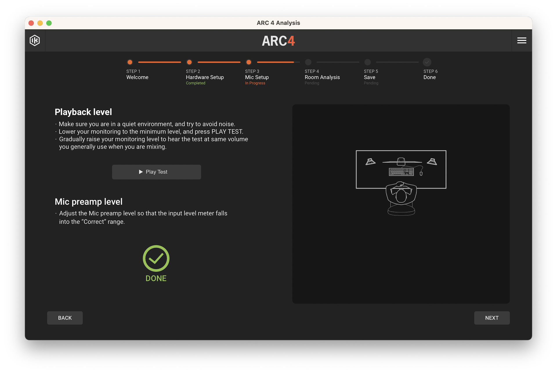 Luego, será el momento de realizar una prueba de niveles, donde habrá que posicionar el micrófono en el lugar que nos vaya indicando el proceso, a la altura de nuestras orejas. Bajaremos el nivel de monitoreo de la interfaz al mínimo, daremos play y, gradualmente, subiremos el nivel hasta escuchar al mismo volumen que solemos trabajar.