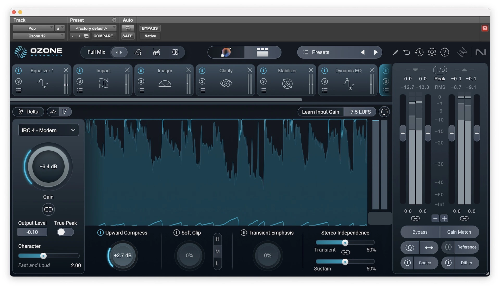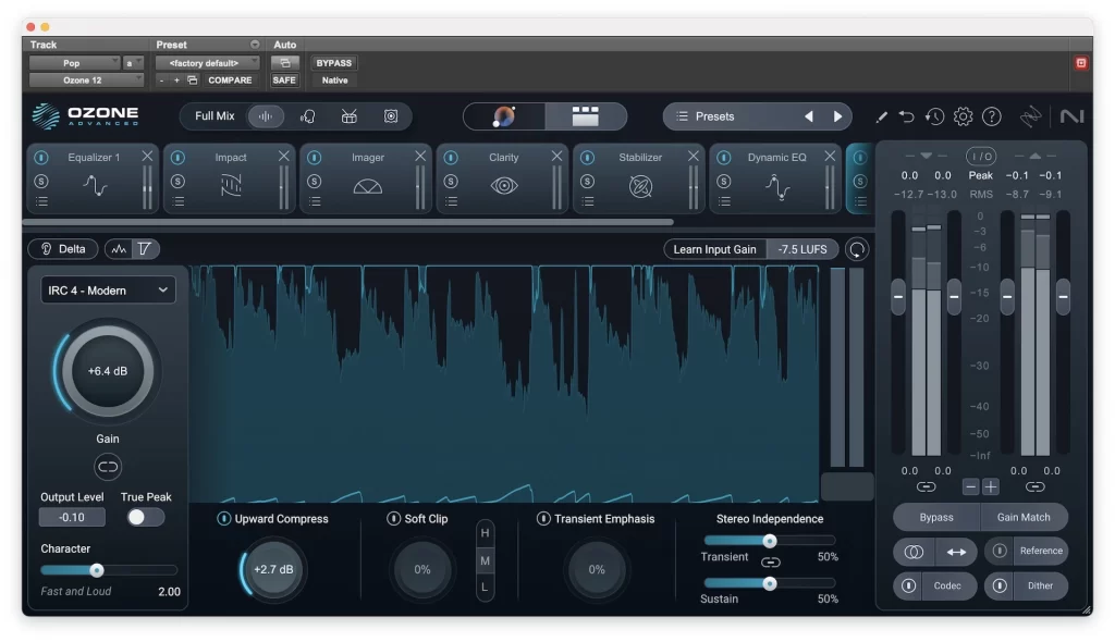 En cuanto al rendimiento general, Ozone 12 fluye en sistemas modernos, incluso con múltiples módulos activos. Sin embargo, hay que mencionar que el consumo de CPU puede incrementarse al usar módulos como Stem EQ o Unlimiter, pero siempre dentro de márgenes razonables para sesiones profesionales.