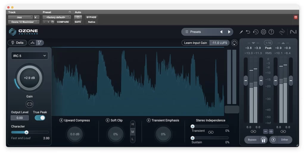 Maximizer introduce el nuevo algoritmo IRC 5 (Intelligent Release Control), un nuevo modo que utiliza análisis adaptativo de transitorios y liberación temporal variable, lo que nos permite aumentar el nivel de salida sin generar bombeo, ni distorsión audible. La diferencia la percibimos especialmente en materiales con mucha información de alta frecuencia, donde los limitadores suelen producir asperezas. IRC 5 mantiene el brillo y la claridad incluso cuando buscamos niveles de sonoridad para streaming estándar o superiores.