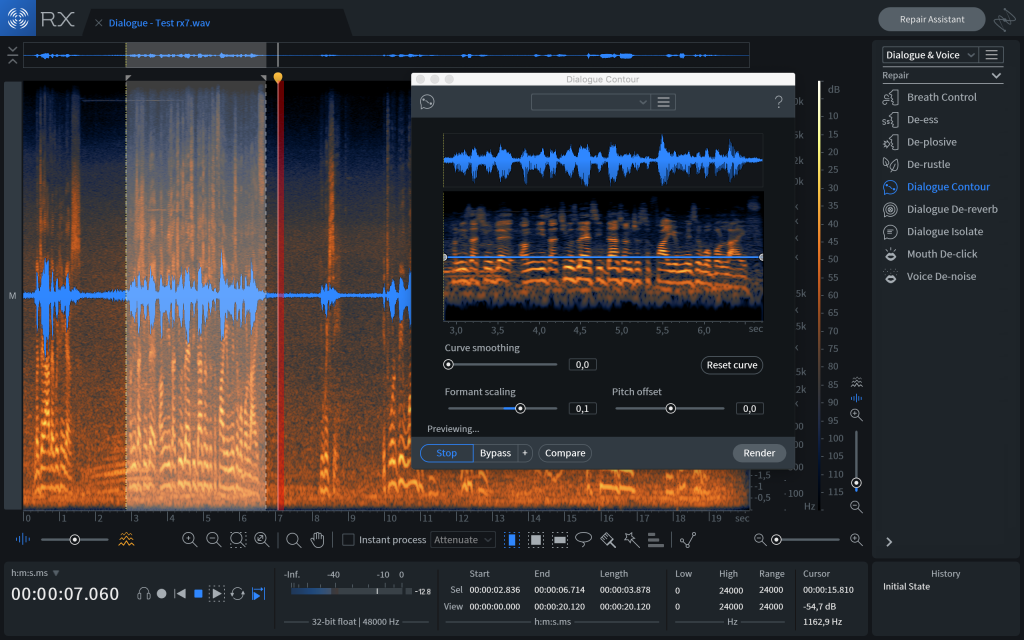 El módulo Dialog Contour, sólo en RX 7 Advanced, puede cambiar la inflexión vocal y resulta útil para hacer algunas correcciones sobre el tono de una sílaba o una palabra para que ésta suene fluida y como si continuara de la palabra anterior.