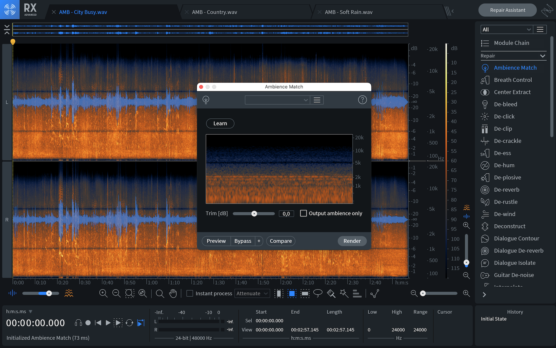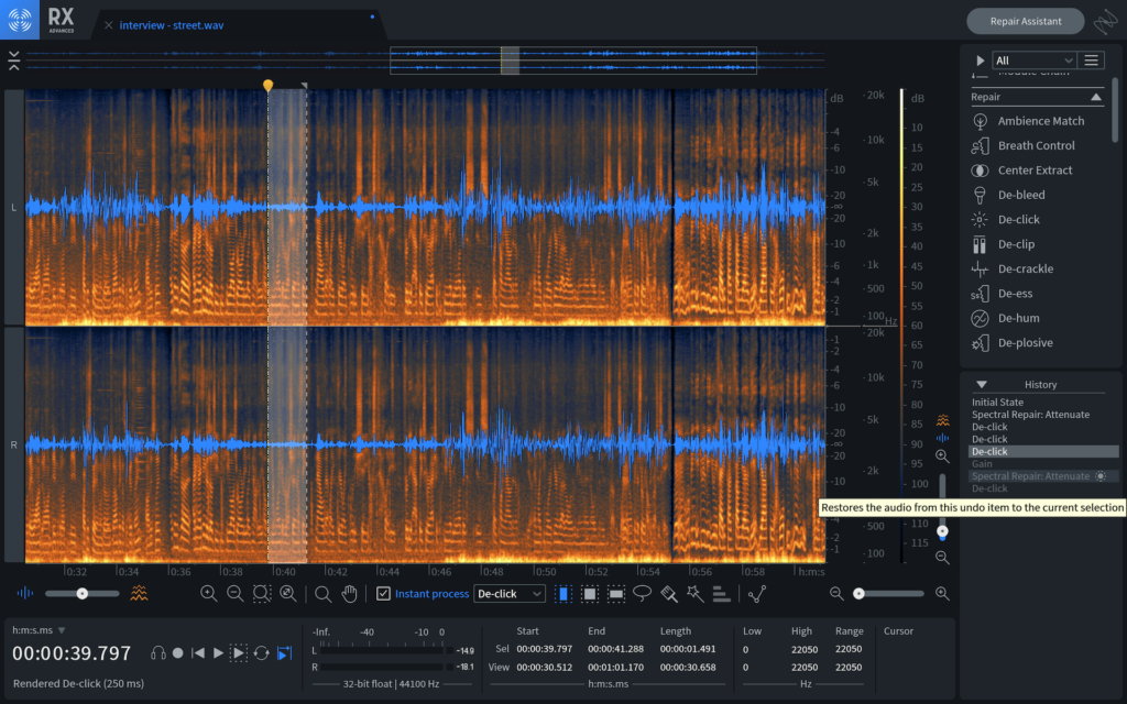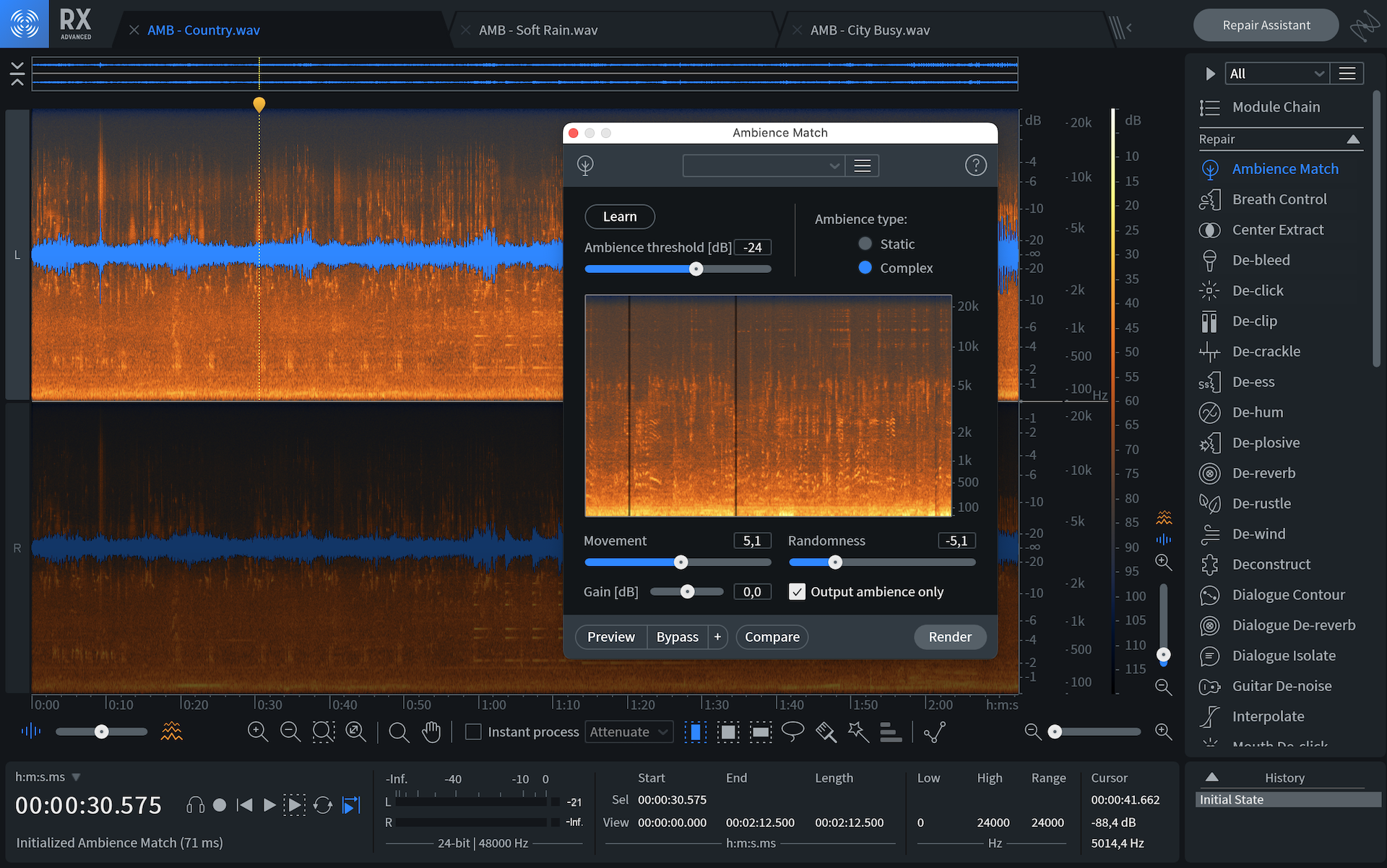 En la versión anterior podíamos muestrear un poco de ambiente estático desde una pieza de audio sin diálogos, generar un loop de ambiente y aplicarlo a una grabación de ADR para que suene como si estuviese grabada en la locación original o simplemente para rellenar espacios entre partes editadas de los diálogos. La opción era excelente pero en general producía un audio demasiado plano y estático. En esta versión iZotope mejoró el módulo para que pudiera extraer ambientes con más elementos. El modo complejo captura más información que el modo estático, la repite y la regenera de una manera más detallada, obteniendo un sonido más natural y realista. Ahora, podemos crear un ambiente no estático con control sobre lo que incluye y cuánto, pudiendo incluir pájaros, lluvia, tráfico, multitudes y más.