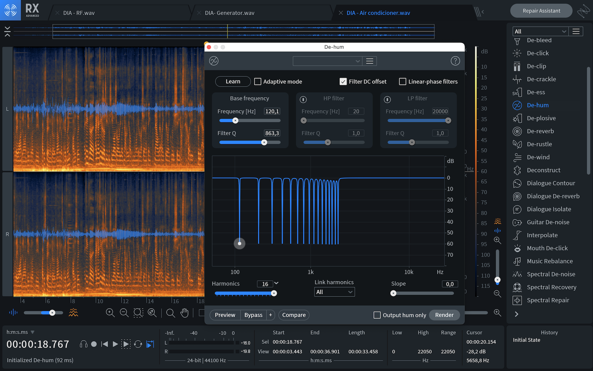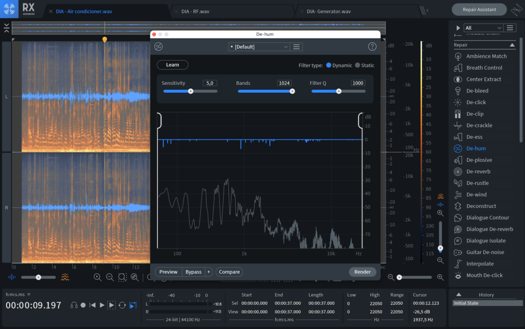 En la versión anterior, De-hum funcionaba correctamente para eliminar algunas bandas y, en general, era más efectivo con la gama baja. Con la incorporación del nuevo modo dinámico, se incorporan hasta 1024 filtros notch dinámicos, los cuales se adaptan en función del nivel de la señal entrante. Los resultados que obtuvimos con la nueva función fueron una reducción de ruido mucho más eficiente y transparente de los sonidos no deseados, además de la posibilidad de hacerlo en una o dos pasadas y con una menor incidencia sobre las fuentes principales de las grabaciones. Así que, sí, otro punto más para iZotope.