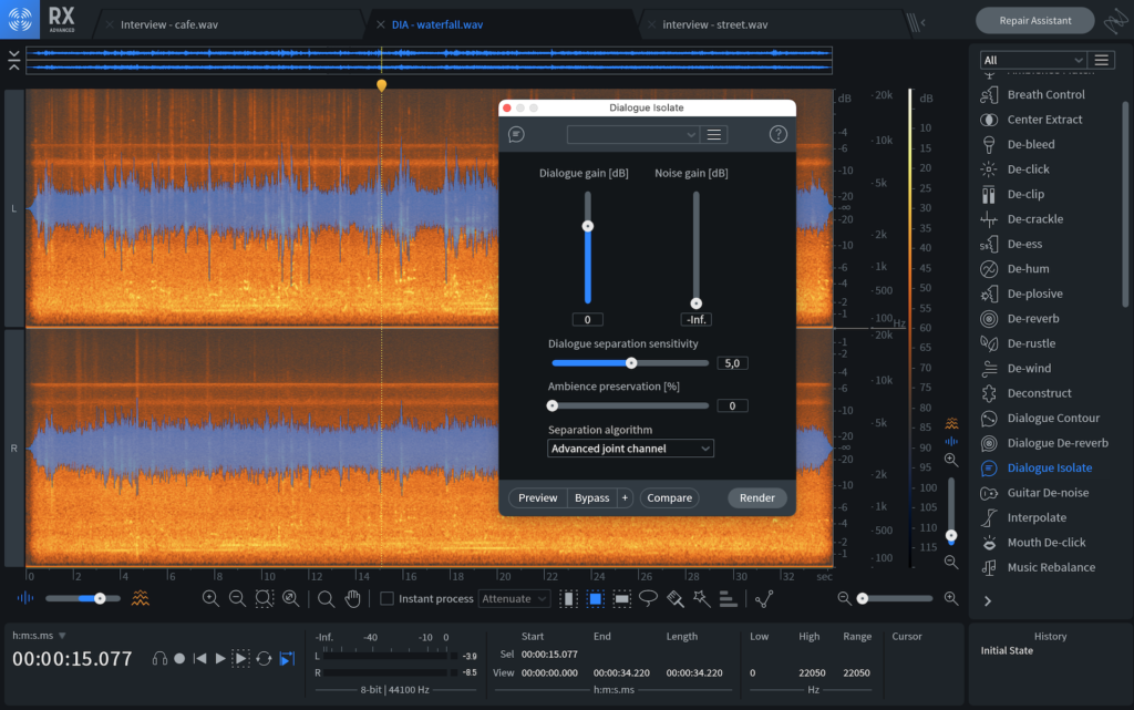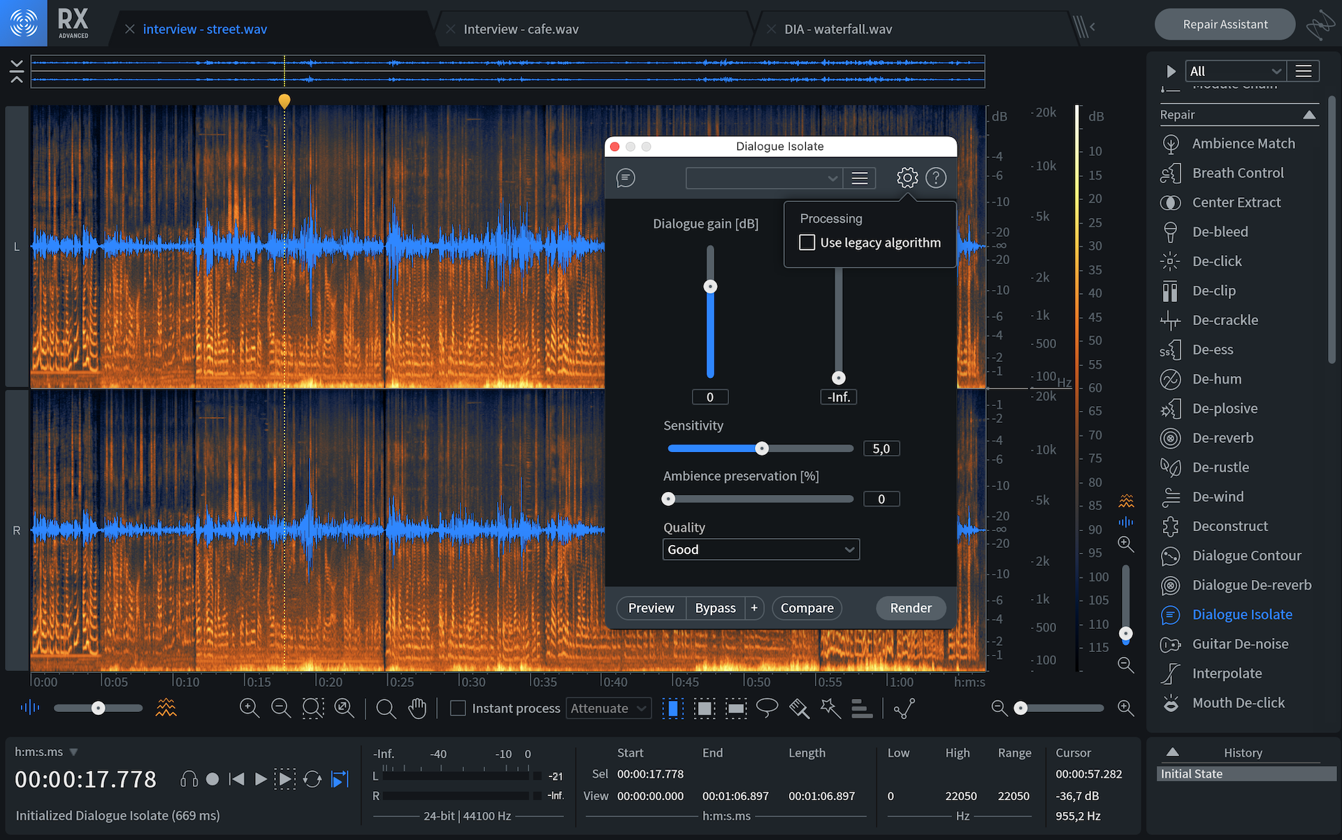 A primera vista, el módulo Dialogue Isolate de RX 9 se ve muy similar al de la versión anterior. Pero no nos dejemos engañar, porque el módulo se ha vuelto más poderoso que nunca con la implementación de un nuevo algoritmo de machine learning y ahora, separar diálogos del ruido es un proceso más eficiente. Con el anterior algoritmo se obtenían buenos resultados, pero solía generar artefactos con grabaciones problemáticas. Pero allí es donde el nuevo algoritmo mantiene la voz un poco más estable y limpia, a cambio de un tiempo de renderización un poco más largo. Podemos decir que las mejoras fueron de aproximadamente un 20% más de eficacia. Si bien parece poco, tengamos en cuenta que este tipo de herramientas se suelen utilizar en flujos de trabajo con fechas límites muy ajustadas, donde cada minuto importa. Así que una mejora del 20% es más que bienvenida. De todos modos, podemos seguir utilizando el algoritmo anterior seleccionando la opción “Usar algoritmo heredado” y de este modo, tendremos una opción extra en caso de que con el nuevo algoritmo no obtengamos el resultado deseado.