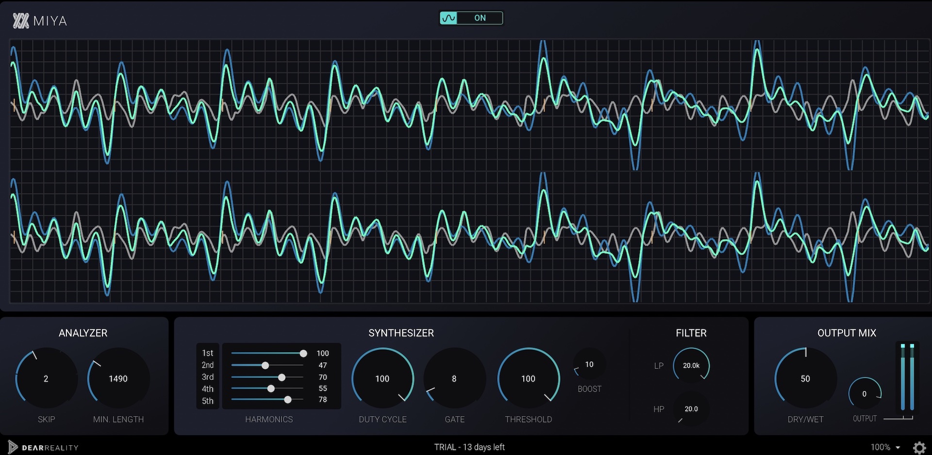 Miya es un plugin distinto a lo que nos tiene acostumbrado la compañía, tal y cómo dijo Felix Lau, Dear Reality: “Somos especialistas en audio espacial, pero también nos apasionan los algoritmos de audio emocionantes fuera de nuestro enfoque de audio espacial. Un ejemplo perfecto de esto es la tecnología de distorsión digital única de MIYA, en la que el oyente puede reconocer tanto la huella del sonido original como la del sintetizado”.