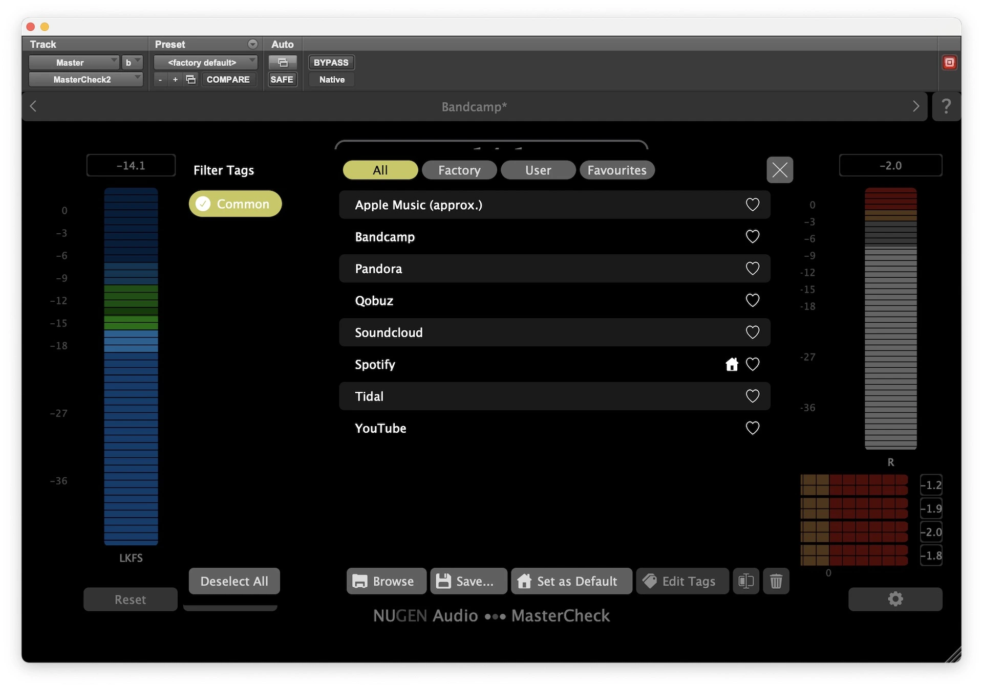 Otro punto fuerte de MasterCheck 2 es la ampliación y actualización de sus presets de plataformas. Spotify, Apple Music, YouTube, Tidal, SoundCloud, Bandcamp o Qobuz, cada servicio tiene sus propias reglas y el plugin las traduce en un lenguaje comprensible.