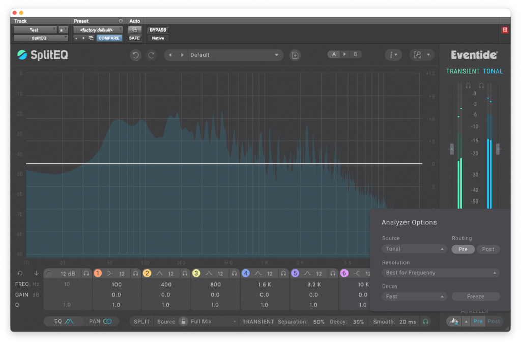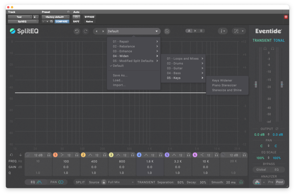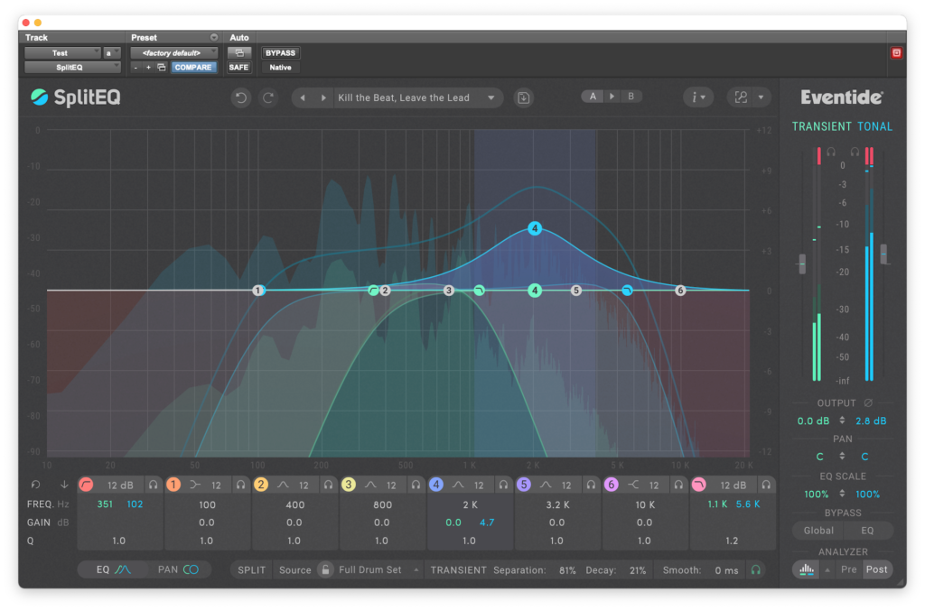 A diferencia de los numerosos plugins de modelado de transitorios que existen en el mercado, como el Flux BitterSweet Pro, el Waves Smack Attack o el SPL Transient Designer Plus, por nombrar algunos, que trabajan sobre elementos individuales en una mezcla, SplitEQ no sólo puede utilizarse en un pista individual, sino que también puede abordar tareas quirúrgicas relacionadas con la mezcla y la masterización, algo que sin lugar a dudas muchos profesionales agradecerán al utilizar este gran plugin.
