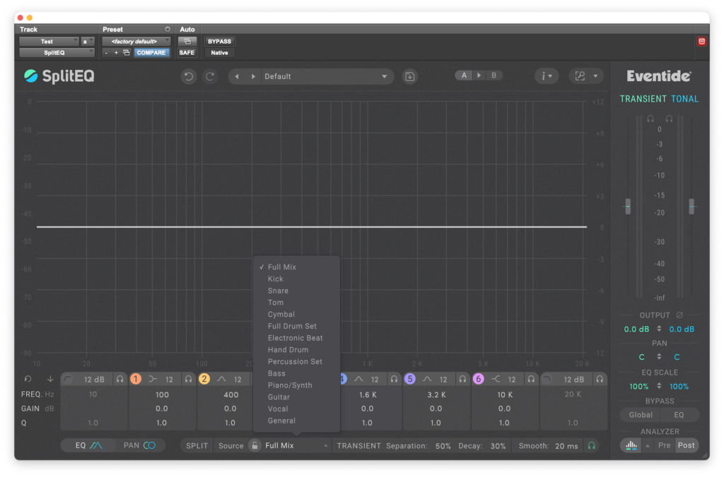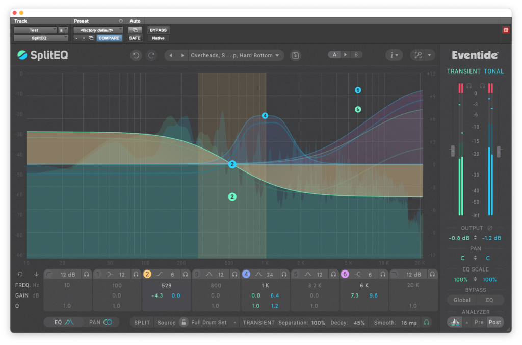 Una vez que ya tenemos una breve idea de cómo están organizados los elementos en SplitEQ, abordamos la sección de ecualización que tiene ocho bandas, seis flexibles, más una de paso alto y otra de paso bajo, con pendientes que pueden ir desde los 6 hasta los 96 db por octava. En las seis bandas principales podemos elegir entre tipos de filtro Low Shelf, Peak, Notch, High Shelf, Tilt Shelf y Bandpass. Además contamos con un útil botón ‘Solo’, para escuchar la señal tonal o transitoria, de formar individualmente o juntas.
