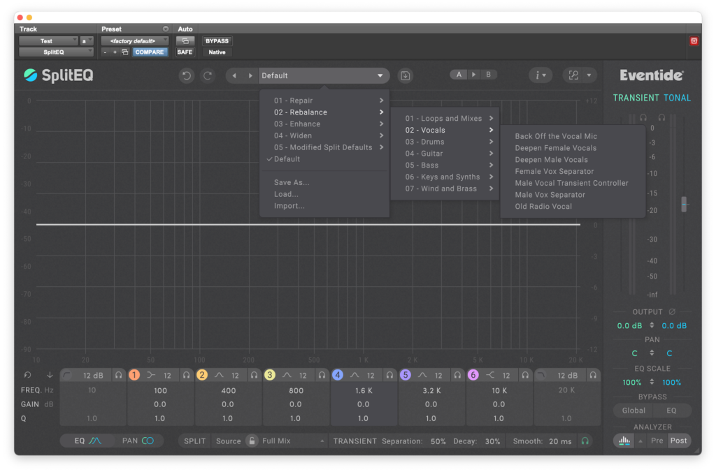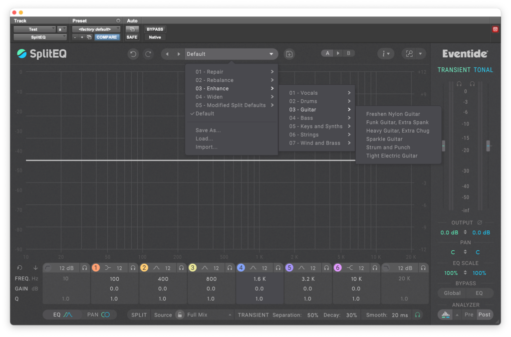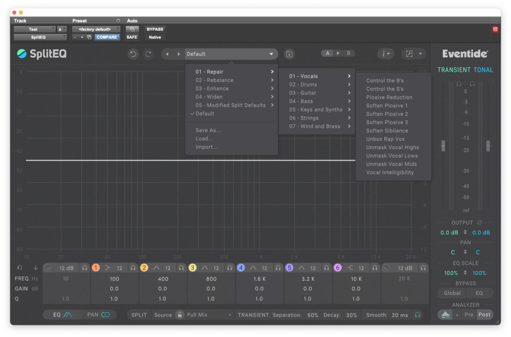 Algo muy útil para comenzar a familiarizarnos con el uso de SplitEQ son sus generosos presets, los cuales están organizados en cinco prácticas carpetas (Reparar, Rebalancear, Mejorar, Ensanchar y Modificar valores por defecto de Split) las cuales a su vez se ramifican en Voces, Batería, Guitarra, Bajo, Teclados y Sintetizadores, Cuerdas, Vientos y Metales. Muchos de estos presets nos ofrecen resultados casi inmediatos, casi sin ajustes, mientras que otros funcionan como punto de partida para encontrar lo que necesitamos.