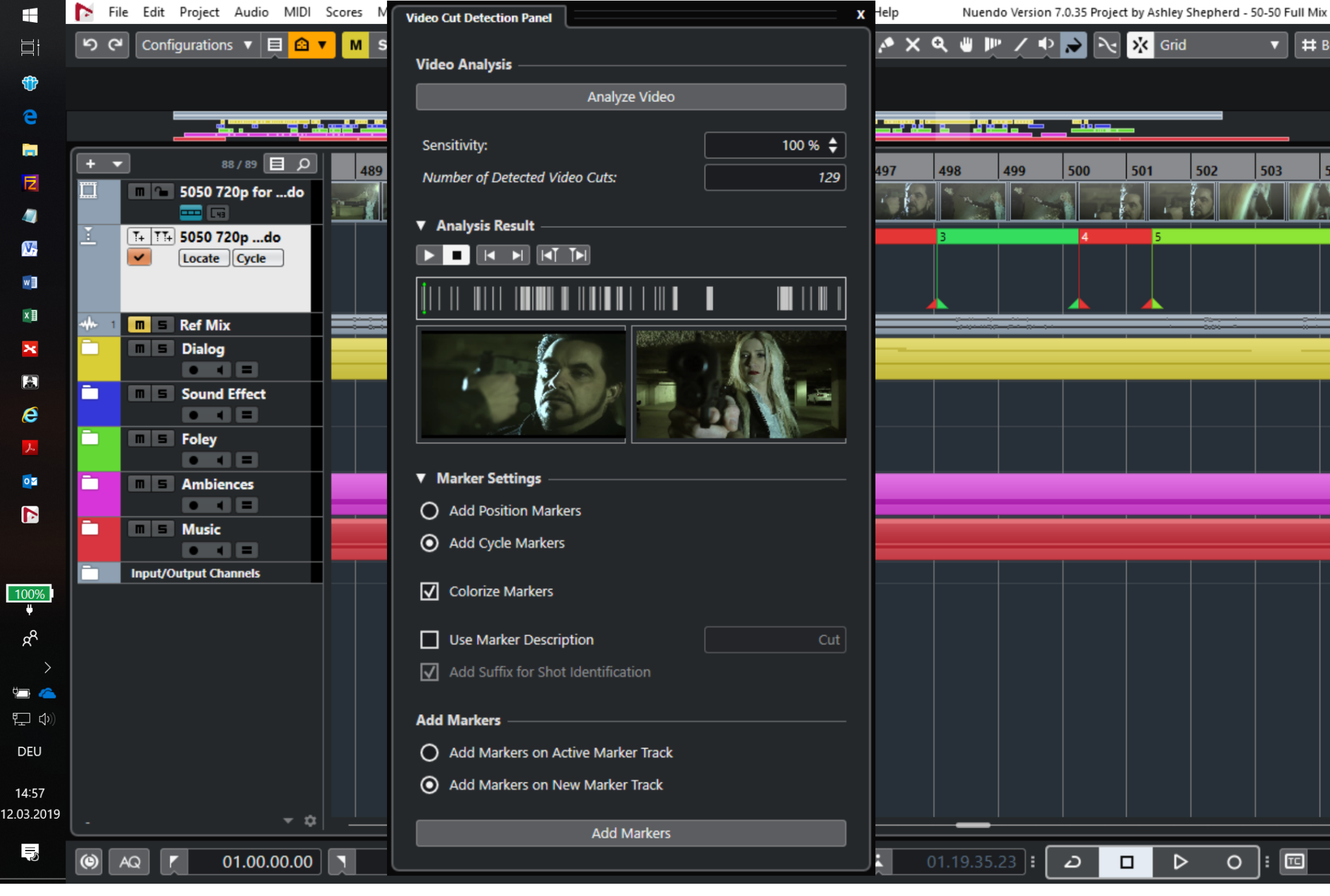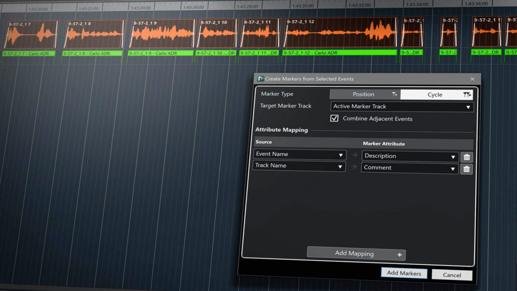 La nueva herramienta Create Markers creará marcadores ADR a partir de uno o más eventos y se pueden configurar automáticamente los atributos de los marcadores utilizando información derivada del clip, como código de tiempo, nombre de la pista, los metadatos del clip, número de escena, etc.