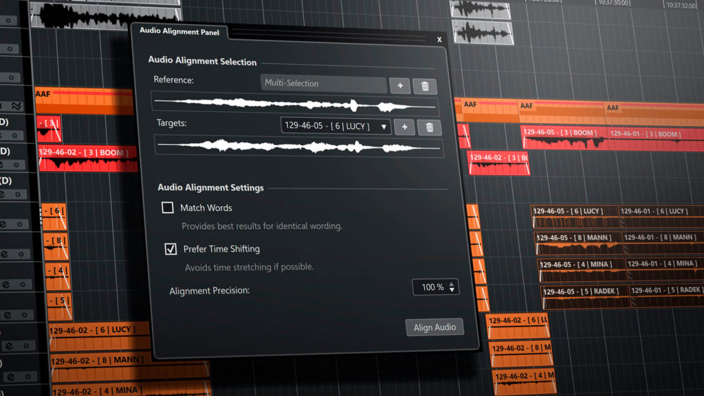 Nuendo 12 también ha mejorado la función Audio Alignment. Cuando los actores están en movimiento, la distancia entre el micrófono de solapa y el micrófono boom varía, lo que produce un desplazamiento de fase a lo largo del tiempo. Ahora podremos alinear múltiples clips de las grabaciones de campo de una escena completa a múltiples referencias, como por ejemplo, alinear todos los clips recibidos de un micrófono lavalier con la pista de referencia de un micrófono boom. Y todo, de forma no destructiva.