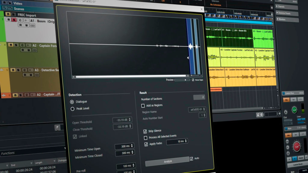 Gracias a la revisión del algoritmo de detección de diálogos impulsado por IA, la eliminación automática de los silencios de las grabaciones de diálogos se ha vuelto mucho más sencilla y confiable. La función Detect Silence elimina el ruido no deseado de una pista dejando solo las partes del diálogo e incluso, nos permite escuchar el resultado antes de enviarlo a la pista de diálogo.