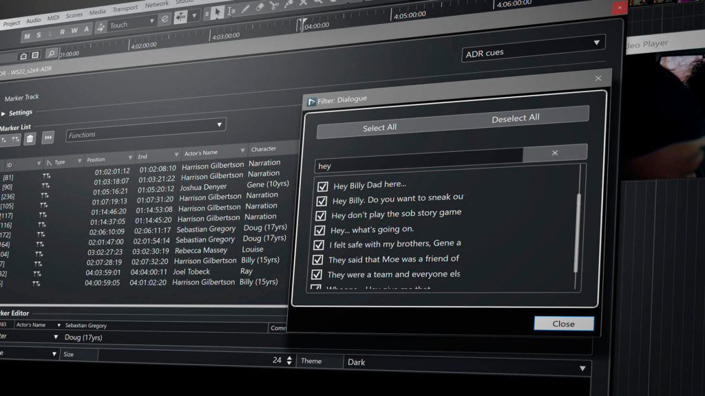 Los datos ADR los podremos utilizar con la herramienta ADR Taker, diseñada para administrar nuestras sesiones de sobregrabación. La misma ahora incluye un sistema de búsqueda que nos permite filtrar la lista de marcadores en función de atributos como el número de escena, el personaje, el artista de doblaje y más. Esto nos será de gran ayuda para enfocarnos sólo en los clips en los que tenemos que trabajar.