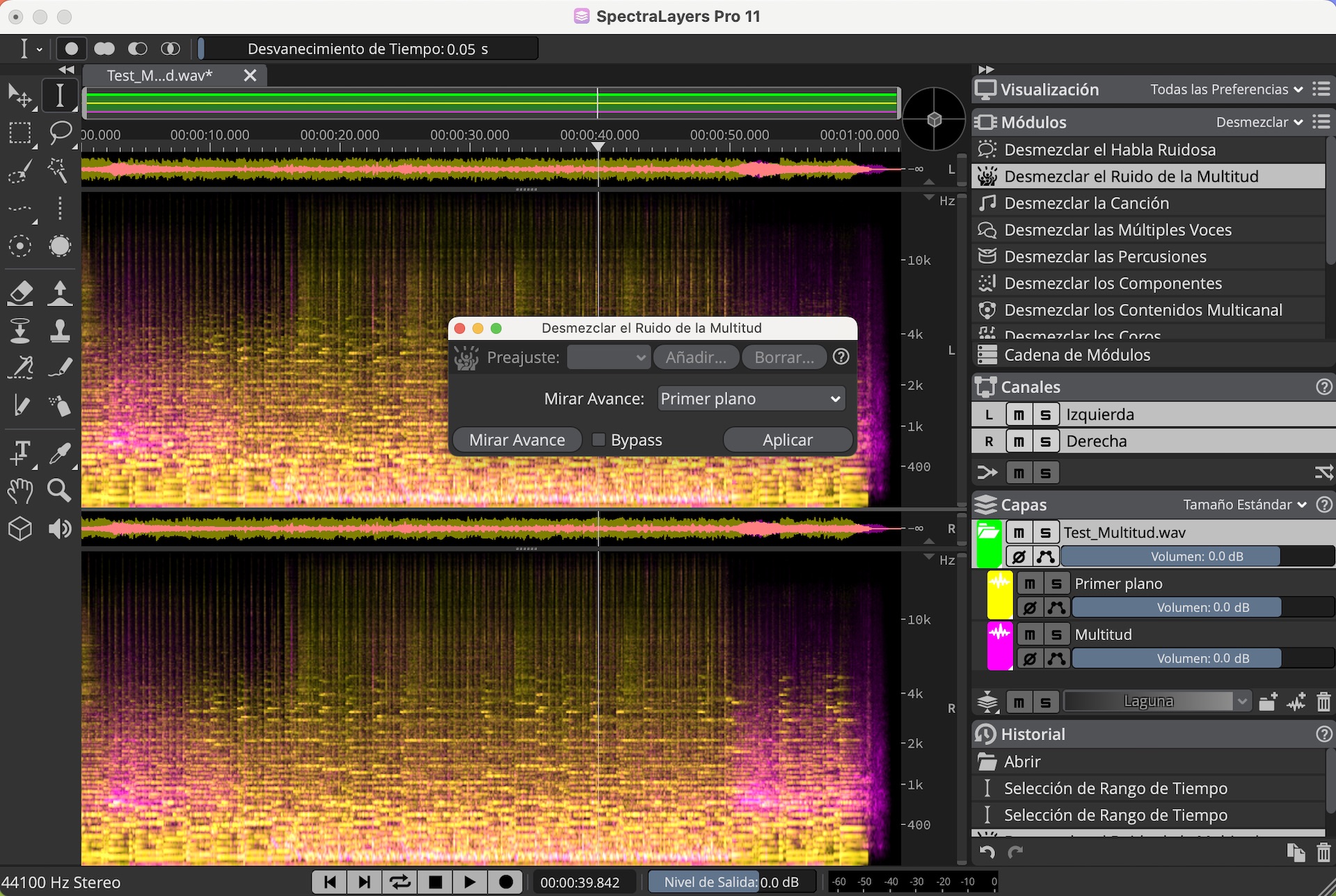 El módulo de Desmezclar el Ruido de la Multitud, nos permite separar entre el ruido de una multitud y el contenido de primer plano, con resultados realmente sorprendentes. Muy útil para quitar el ruido de la gente en un concierto o un discurso, por ejemplo.
