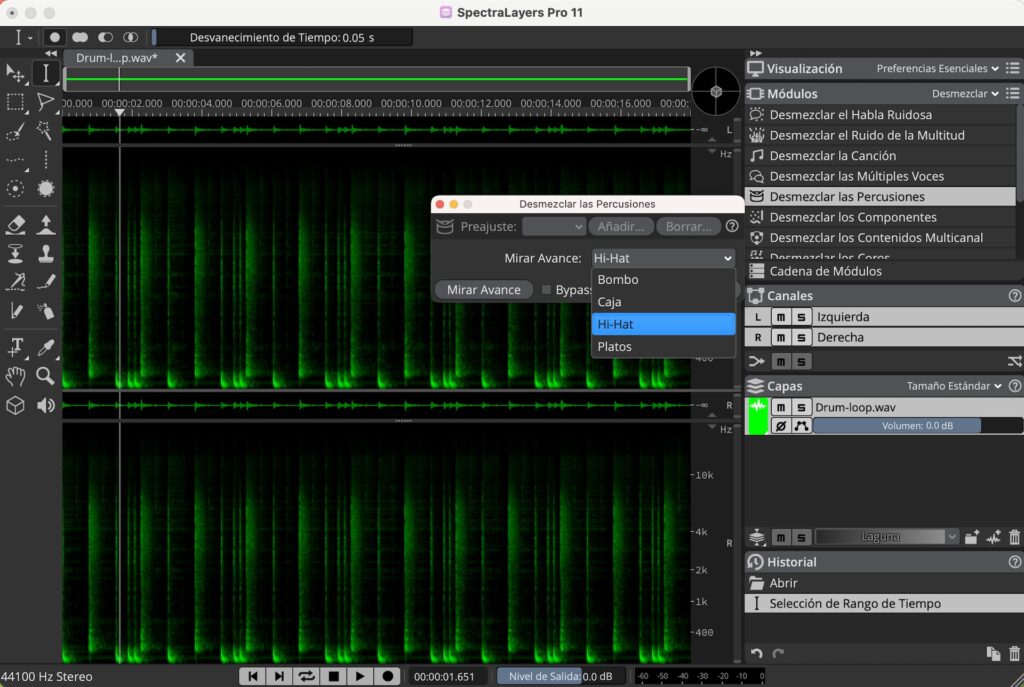 Respecto a los Módulos de Desmezclar, tenemos por una lado mejoras en el módulo Desmezclar la Canción, cuando seleccionamos calidad alta o extrema, obtendremos resultados de una mejor calidad en los instrumentos y ahora, podremos desmezclar saxos y metales. También se mejoró la calidad de Desmezclar las Percusiones y ahora podremos separar entre platos y hi-hats. Esto lo podremos llevar a cabo en pistas que contengan baterías únicamente, así que si tenemos una canción completa, primero deberíamos usar el módulo de Desmezclar la Canción. Al usar el módulo en calidad alta o extrema, el tiempo de procesamiento y uso de la CPU lógicamente se incrementa.