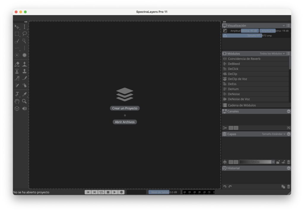 Uno de los principales cambios es el nuevo diseño de la pantalla de bienvenida. Cuando iniciamos SpectraLayers como aplicación independiente, la pantalla de inicio nos permitirá acceder rápidamente a nuestros proyectos más recientes, abrir un archivo o directamente arrastrarlo y soltarlo, o bien, crear un nuevo proyecto. No podemos dejar de mencionar el parecido con RX en este aspecto, lo cual seguramente facilitará la transición a cualquiera que haya estado usando el software de la competencia y esté buscando un cambio.