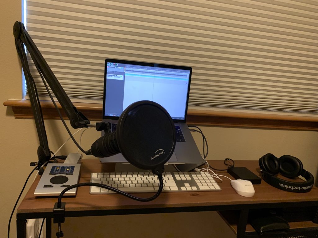Al realizar entrevistas en persona, Rotstein puede colocar su Babyface Pro, dos micrófonos con soporte y su computadora portátil en una sola bolsa, lo que hace que su configuración de audio sea versátil y portátil.