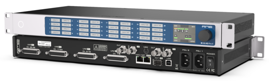 RME anunció la serie M-32 Pro II que consta de cuatro nuevos dispositivos de red de audio. Cada unidad consta de una combinación específica de DANTE, AVB y MADI y ofrece 32 canales de conversión A/D o D/A de clase de referencia.