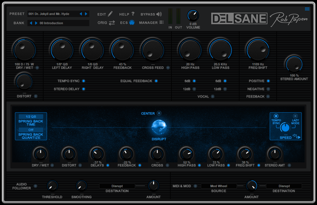 Al facilitar el paso del sonido retardado a las aguas de la producción musical moderna, ya sea cuerdo o no, mientras se evita cualquier dolor muscular en el proceso, la activación del MODO LAZY automatiza el movimiento del control deslizante esférico DISRUPT en diferentes direcciones, lo que permite la creación de coros, flanger o nuevos tipos de efectos de modulación, mientras que la función AUDIO FOLLOWER facilita la influencia de varios parámetros del delay, ¡incluido el control deslizante esférico DISRUPT! Mientras tanto, MIDI & MOD ofrece una mayor flexibilidad cuando se trata de influir en esos diversos parámetros del delay.