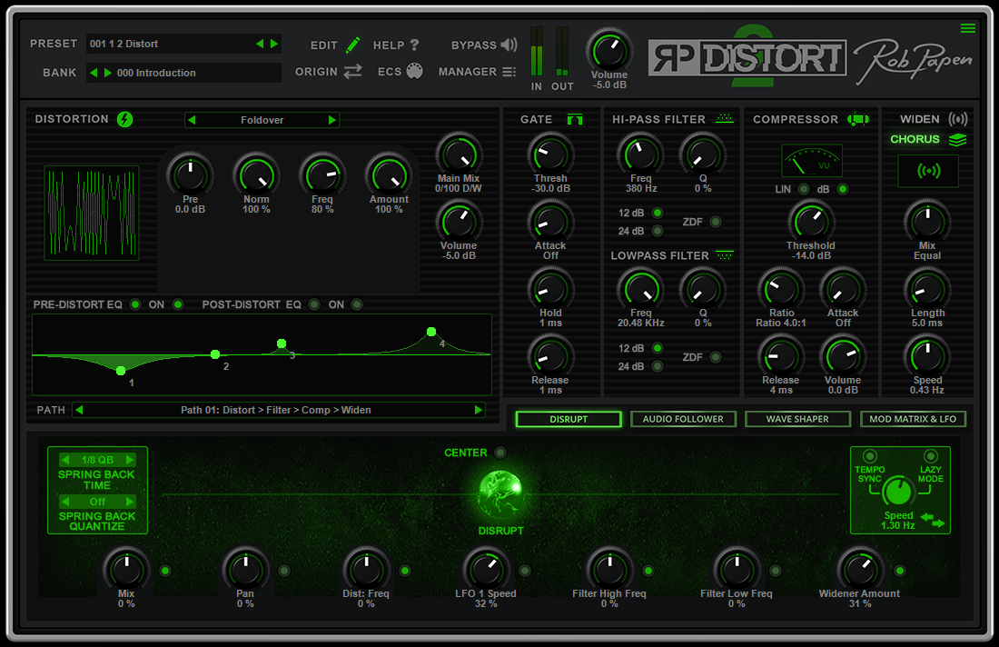 Mirando de cerca a RP-Distort 2, se hace evidente que comparte algunas similitudes con DelSane, uno de los plugins lanzados más recientemente de Rob Papen a la que debe su innovadora “esfera” DISRUPT. Dice el mismo Rob Papen: “Esto te permite controlar varios parámetros de modulación diferentes a la vez, ¡y se vuelve aún más emocionante si usas el AUDIO FOLLOWER para tomar el control de la ‘esfera’ DISRUPT!”