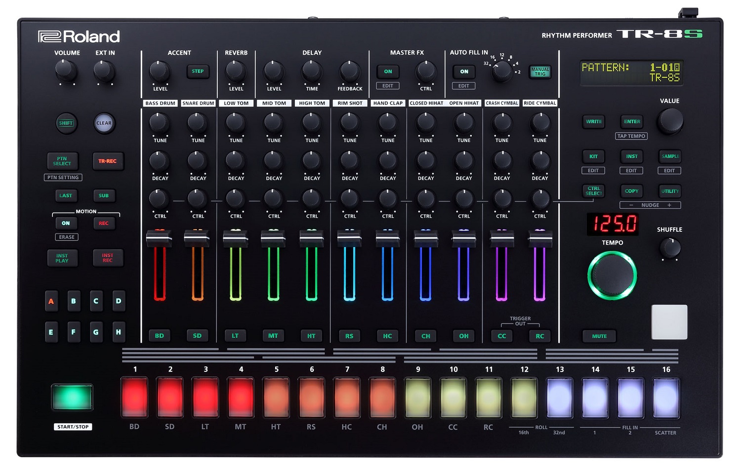 El TR-09 ofrece el poder de la icónica caja de ritmos TR-909 de Roland en un formato compacto y accesible. Recrea el sonido híbrido influyente de su predecesor utilizando tecnología ACB, con el familiar estilo de programación TR-REC de 16 pasos y una selección de modos de escritura step o tap. Entre las mejoras la posibilidad de no hacer pausa al conmutar de modo reproducción a modo edición o la presencia de un compresor como unidad de efecto. Cuenta con memoria para 96 patrones y 8 pistas agrupando patrones. Es posible gestionar volcados para copias de seguridad y liberación de espacio para nuevos proyectos vía USB. Además está diseñado para una fácil conectividad con equipos externos, con una selección de MIDI, USB y puertos de activación que dan control sobre sintetizadores vintage analógicos, equipamiento modular y aplicaciones musicales.