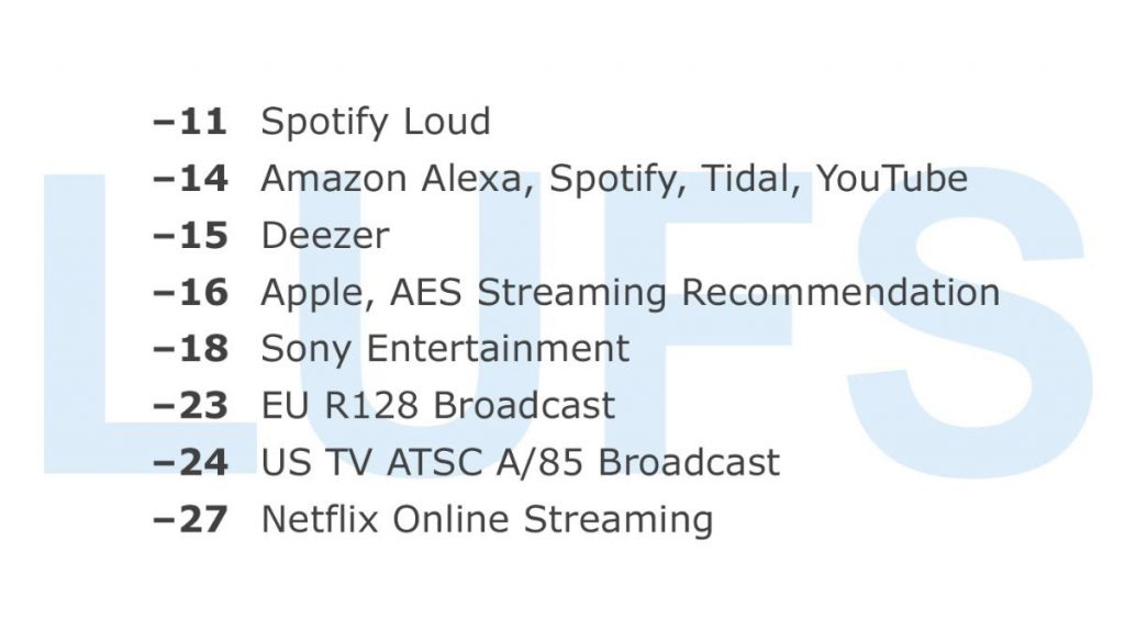 Por lo tanto, compañías como Spotify, Netflix, Apple, Sony, Amazon, Tidal y Google (YouTube) ahora tienen sus propias pautas de entrega de volumen. Algunos de ellos son similares en términos de Integrated Loudness (LUFS), pero pueden variar ligeramente con respecto al True Peak (dBTP) y nuevamente algunos son simplemente lo mismo.