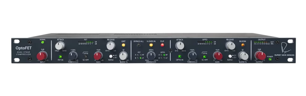 “Desde un suavizado vocal transparente hasta un modelado de envolvente extremo con una textura armónica masiva, el OptoFET ofrece un control creativo aparentemente infinito”, afirma Rupert Neve Designs. Cada compresor ofrece controles totalmente variables de ataque, liberación, umbral, ganancia de compensación y mezcla paralela, además de filtros paso alto de cadena lateral y modos armónicos especiales “GRIT” y “BLOOM”. Además, OptoFET incluye controles globales para invertir el orden de los dos compresores en el modo Dual Stage (FET a Opto vs. Opto a FET), además de un exclusivo control de cruce variable para ajustar con precisión la compresión en las bandas de frecuencia superior e inferior en el modo Dual Band. “Por ejemplo, esto permite al usuario suavizar suavemente las frecuencias altas de una batería con el circuito óptico mientras se usa el FET para controlar agresivamente las frecuencias bajas; existen muchas combinaciones posibles y fomentamos la experimentación creativa”. La compañía añade: “Aunque se trata de una unidad de un solo canal, un par de OptoFET en mono dual, con controles de 31 posiciones con retención completa, puede añadir un gran impacto a pistas estéreo, grupos o incluso mezclas completas”. Aunque los nuevos modos GRIT y BLOOM puedan evocar los conocidos circuitos SILK de la compañía, el equipo de RND afirma que, en realidad, son bastante diferentes. “Con SILK, siempre hemos confiado en nuestros transformadores de diseño personalizado para generar armónicos musicales. Con GRIT y BLOOM, los armónicos son generados por los propios circuitos de compresión FET y Opto, específicamente en su interacción con la cadena lateral. Esto le otorga a GRIT y BLOOM un carácter sonoro notablemente diferente al de SILK, pero igualmente útil en diversas ocasiones”.