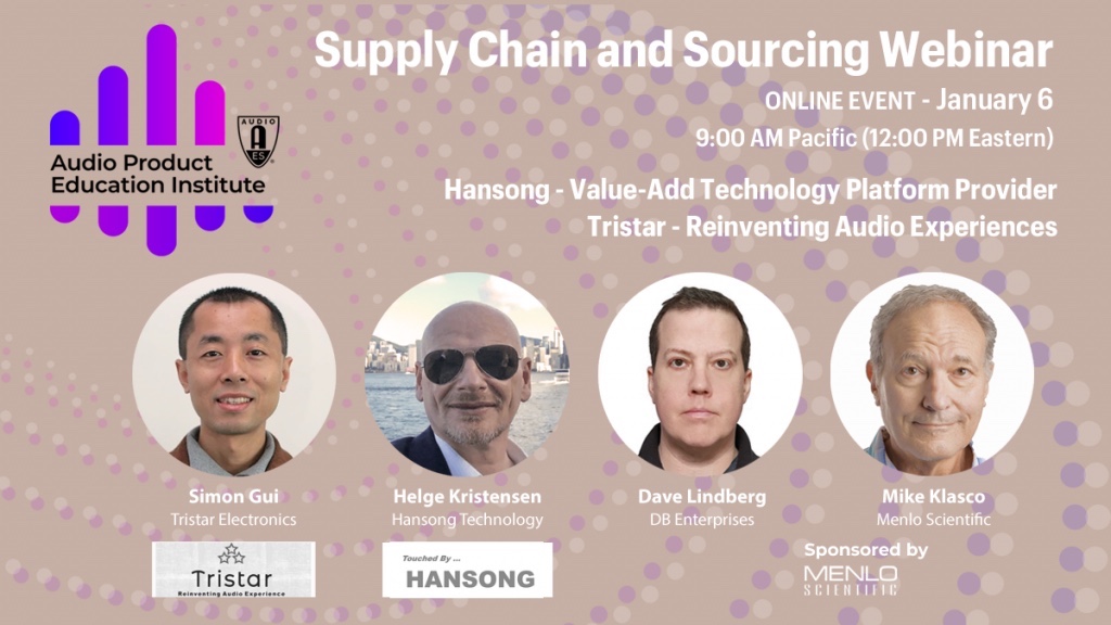 El instituto de educación de productos de audio (APEI), una iniciativa lanzada en enero de 2020 por la Audio Engineering Society (AES) para enfocarse en promover metodologías, prácticas y tecnologías involucradas en el desarrollo y llevar productos de audio al mercado, albergará su cuarto evento en línea sobre Cadena de suministro & abastecimiento el miércoles 6 de enero (12:00 pm EST). El seminario web continúa el diálogo con expertos de la industria de los principales proveedores de la industria del audio: Hansong Technology y Tristar Electronics detallarán las operaciones de sus organizaciones y ofrecerán perspectivas valiosas en este episodio. La conversación será conducida por Dave Lindberg (DB Enterprises) y Mike Klasco (Menlo Scientific), quienes son los presidentes de APEI en Supply Chain & Sourcing, ambos con amplia experiencia y conocimiento en apoyar los esfuerzos de las marcas para convertir ideas en productos y en la fabricación de los mismos. Las dos compañías abordarán problemas oportunos clave que enfrenta la industria del audio y también responderán preguntas de los anfitriones sobre temas clave como restricciones en los viajes, desafíos logísticos y la dinámica de la economía global.