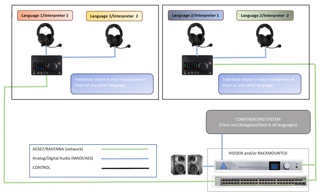 Todos los Anubis están interconectados en red (AES67/ST2110) para que cada transmisión de audio pueda estar disponible en cualquier Anubis. Se utiliza un Hapi Mk II (conversor AD/DA, Madi, AES/EBU) como punto de entrada/salida con todos los formatos estándar para conectarse a la consola, PA o sistema de conferencias existente. Un beneficio clave de esta solución de interpretación es que se puede controlar de forma remota mediante VPN y la dirección IP de cada Anubis.